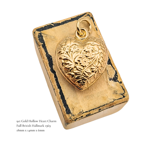 Gorgeous 9ct Gold Puffy Heart Charm Vintage Engraved Floral 1969