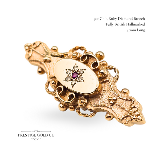 9ct Gold Ruby Diamond Set Ornate Brooch Element Scroll Work, Hand Crafted
