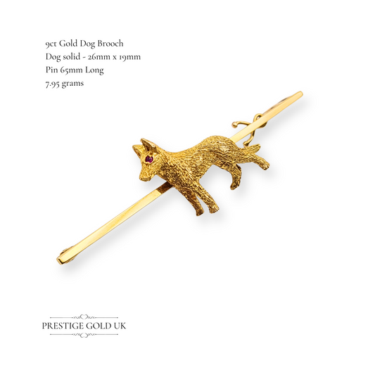 Large 9ct Gold Alsatian Brooch, Heavy Solid Cast Gold Dog With Red Stone Eye