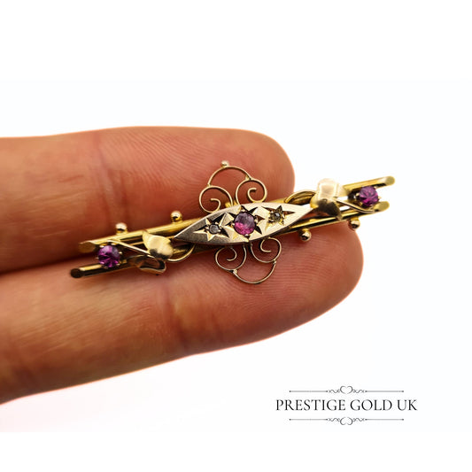 Antique Victorian Solid Gold Diamond & Pink Stone Brooch