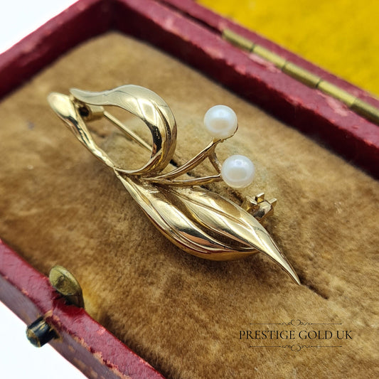 Vintage Leaf Design 9ct Gold & Pearl Brooch