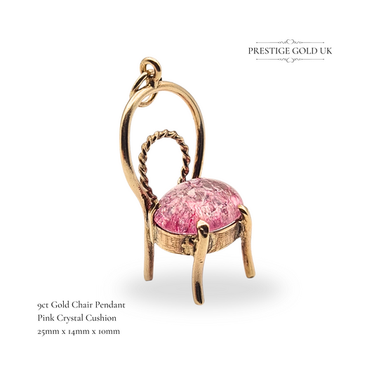 9ct Gold Small Chair Pendant or Charm With Pink Crystal Cushion, Ornate Small Seat