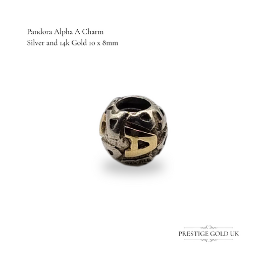Retired Pandora Alpha A Charm Sterling Silver & 14ct Gold Accents 925 ALE 79029A