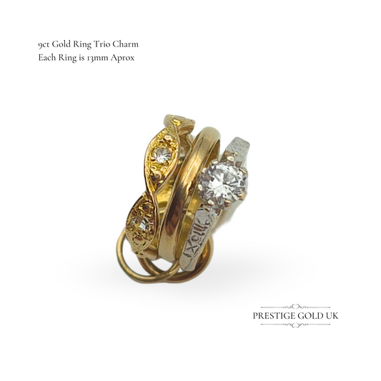 Vintage 9ct Gold Trio Ring Charm, Mini 3 Ring Wedding & Engagement Gift
