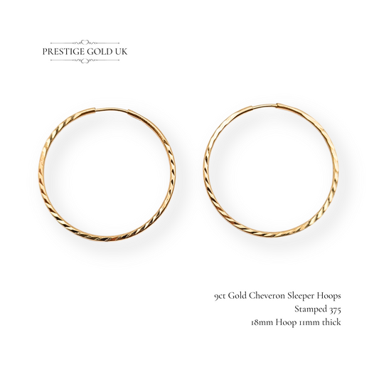 9ct Gold Hoop Earrings, Chevron Pattern Dainty Ladies Sleeper Hoops