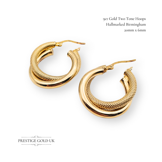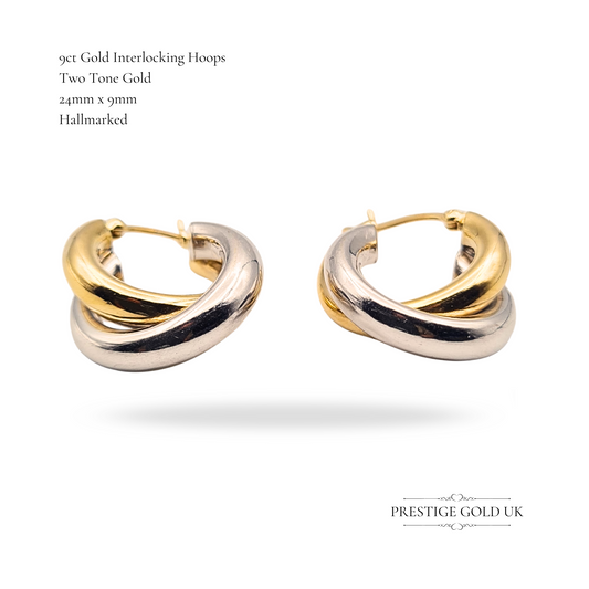 9ct Gold Two Tone Hoop Earrings, Interlocking twist Desing