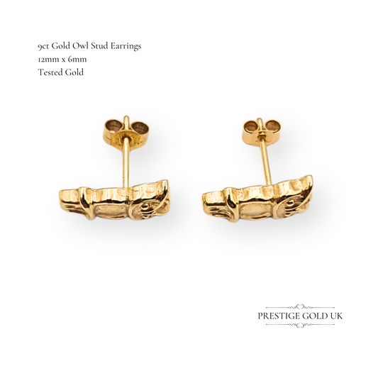 9ct Gold Owl Stud Earrings, Hollow Lightweight Design With Butterfly Backs
