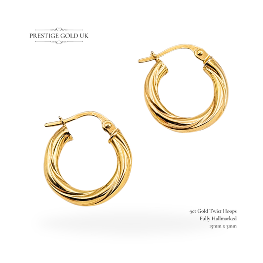 Quality 9ct Gold Rope Twist Hoop Earrings, Vintage 14mm Hoops With Twist Design