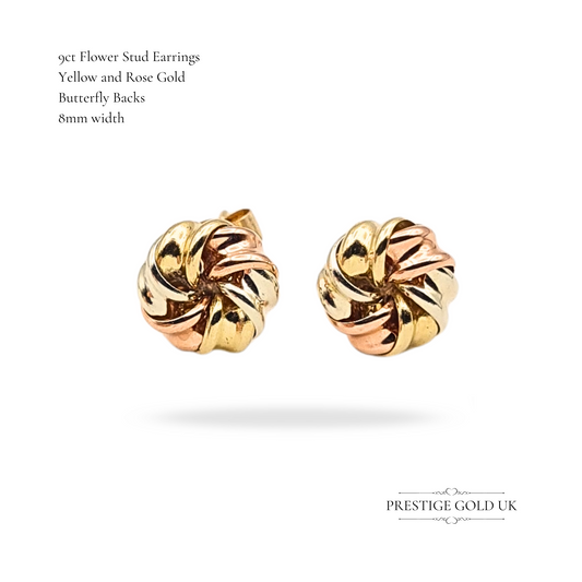 9ct Gold Round Flower Stud Earrings, Yellow, white and Rose Gold Twist Design