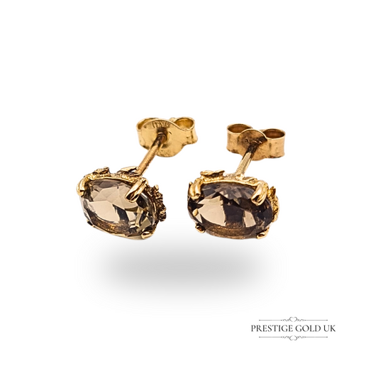 9ct Gold Smoky Quartz Stud Earrings, Oval Claw Set Brown Natural Stone Studs