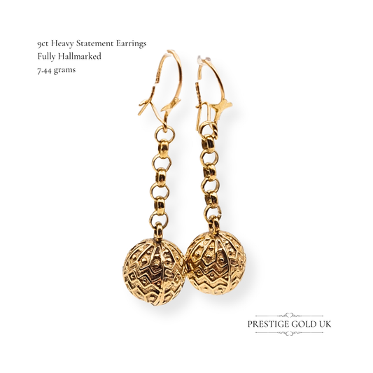 9ct Gold Textured Drop Ball Earrings Unique Ladies Dangle Earrings 44mm long