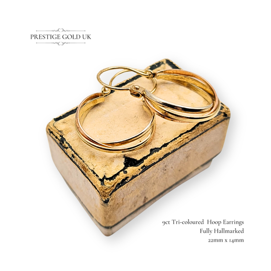9ct Gold Tri Colour Oval Vintage Hoops, Yellow, White & Rose Gold