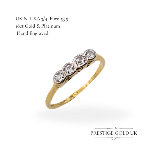 Antique 18ct Gold & Platinum Four Diamond Ring, UK N US 6 3/4 Euro 53.5, Hand Engraved