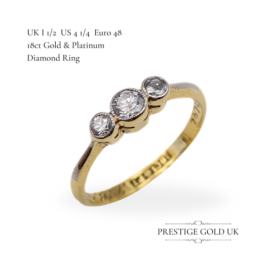Vintage 18ct Gold & Platinum Triple Diamond Ring, UK I 1/2 US 4 1/4 Euro 48, Stamped 18ct, Engraved Band