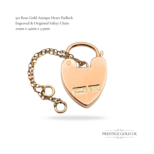 9ct Rose Gold Antique Heart Padlock Pendant, Engraved, With Safety Chain