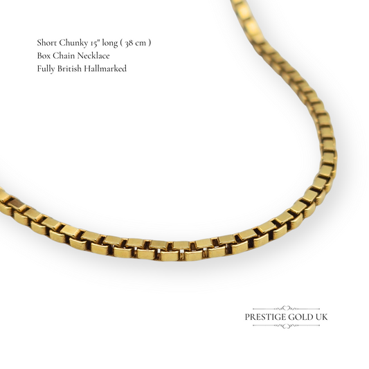 Short 9ct Gold Box Chain Necklace, Chunky Wide Link 15" Long Choker Chain