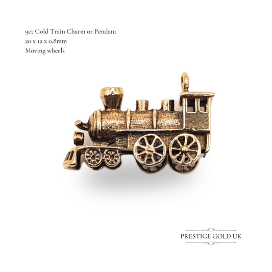 9ct Gold Train Charm Pendant Hallmarked London Moving Wheels