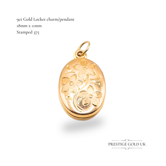 9ct Gold Oval Floral Locket Pendant 18mm x 11mm Lightweight Stamped 375
