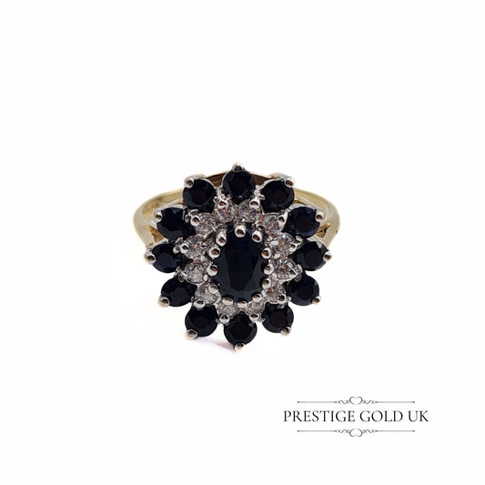 Vintage 9ct Gold Sapphire & CZ Cluster Ring - Size UK M 1/2, US 6 1/2, Euro 53