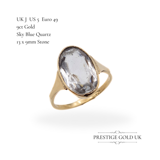 Vintage 9ct Gold Oval Bezel Set Sky Blue Quartz Ring - UK J, US 5, Euro 49