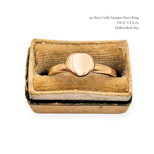 Antique 9ct Rose Gold Heart Signet Ring 1855 UK Q US 8.5