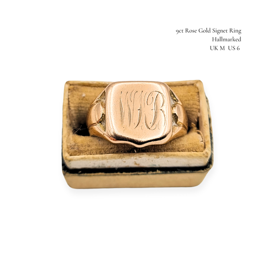 9ct Rose Gold Shield Signet Ring, Engraved WB, UK M US 6