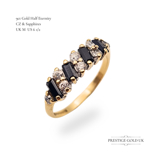 9ct Gold Navy Sapphire CZ Half Eternity Ring UK M US 6 1/2 Baguette Cut Stones