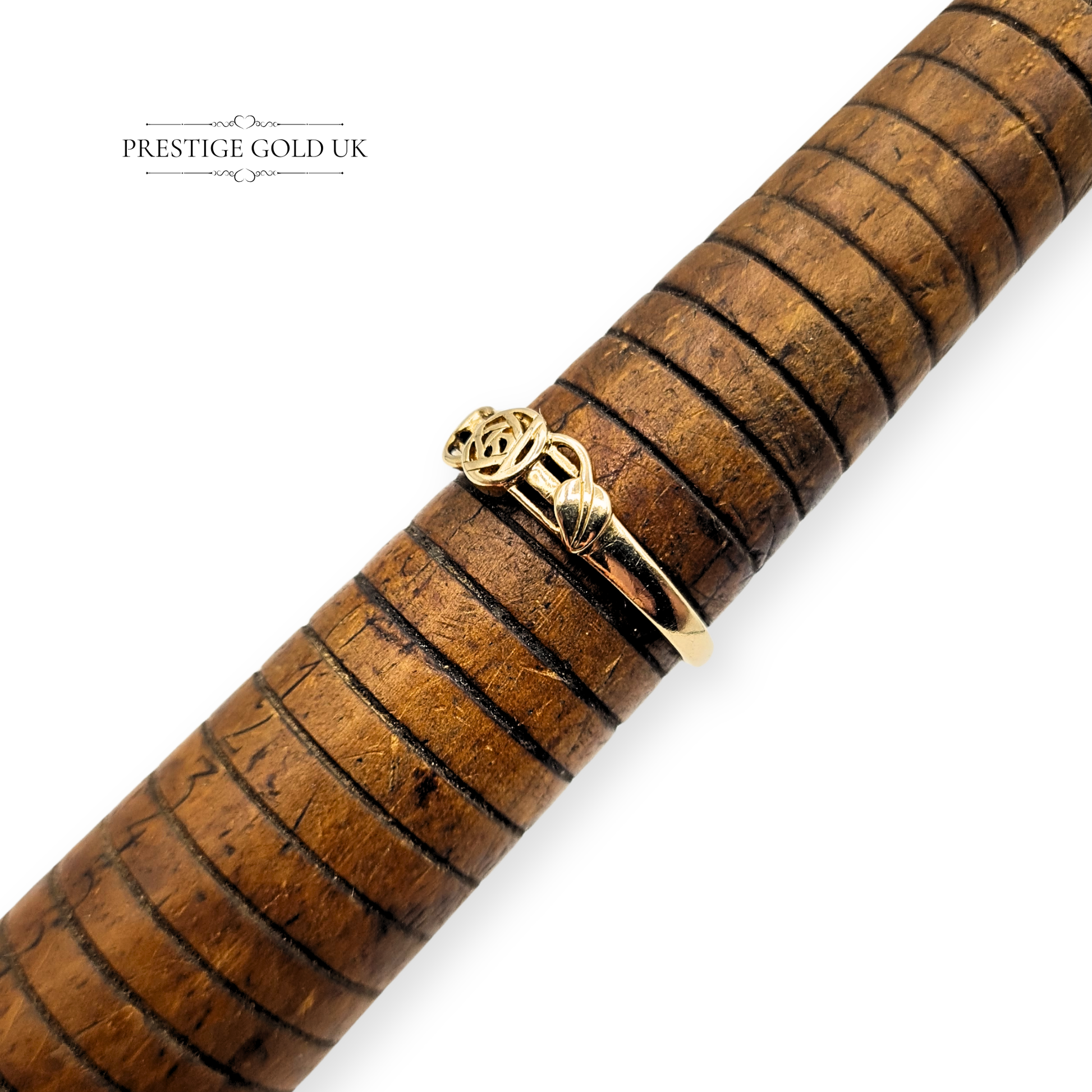 Fully British hallmarked and crafted in solid 9ct yellow gold, this elegant designer ring captures the unmistakable Art Nouveau influence of Rennie Mackintosh’s work. The central rose motif, framed by flowing leaf details, is finely sculpted and balanced within a 5mm band — refined yet striking. Smoothly polished for everyday comfort, it offers a graceful nod to early 20th-century design while remaining timeless and wearable. Only one available.