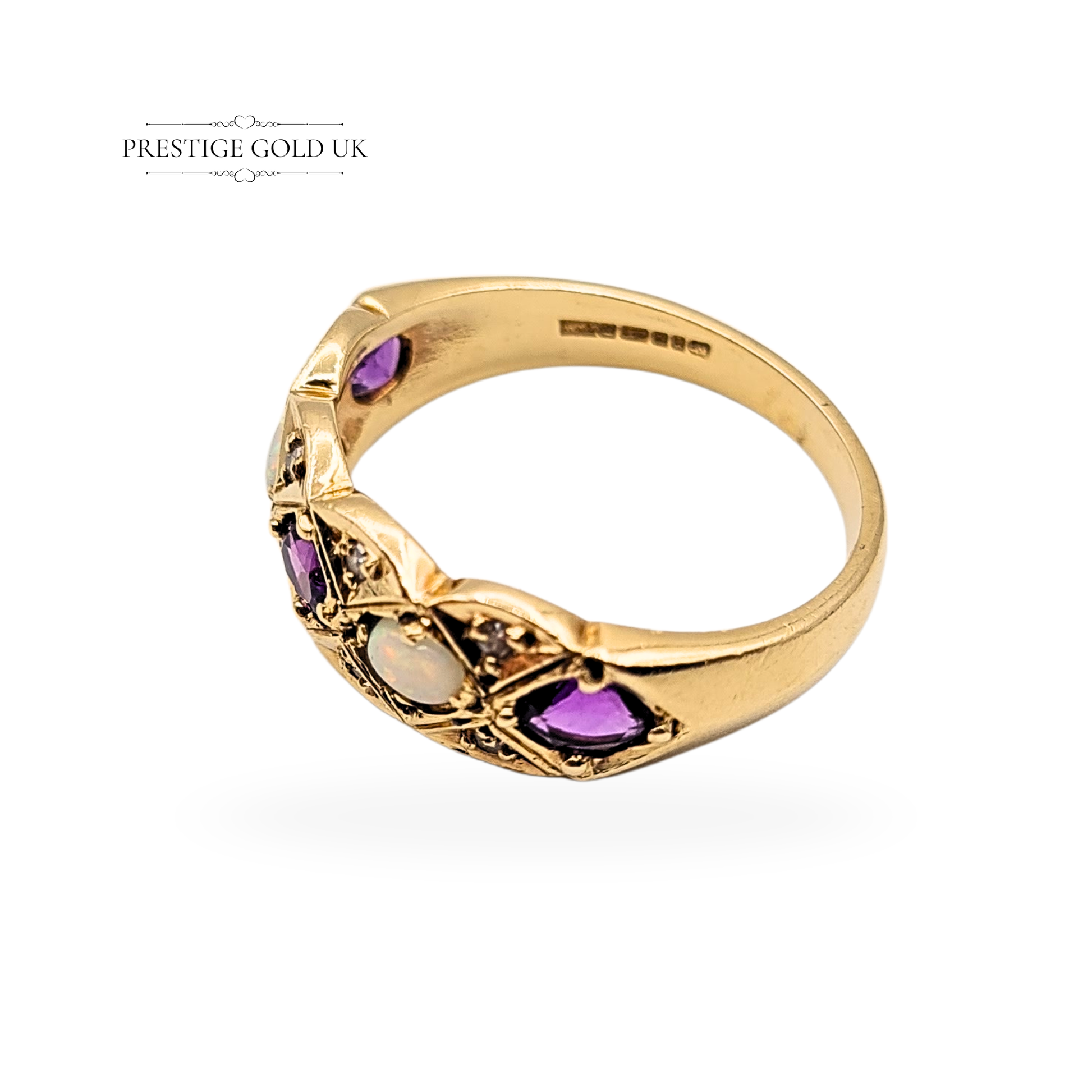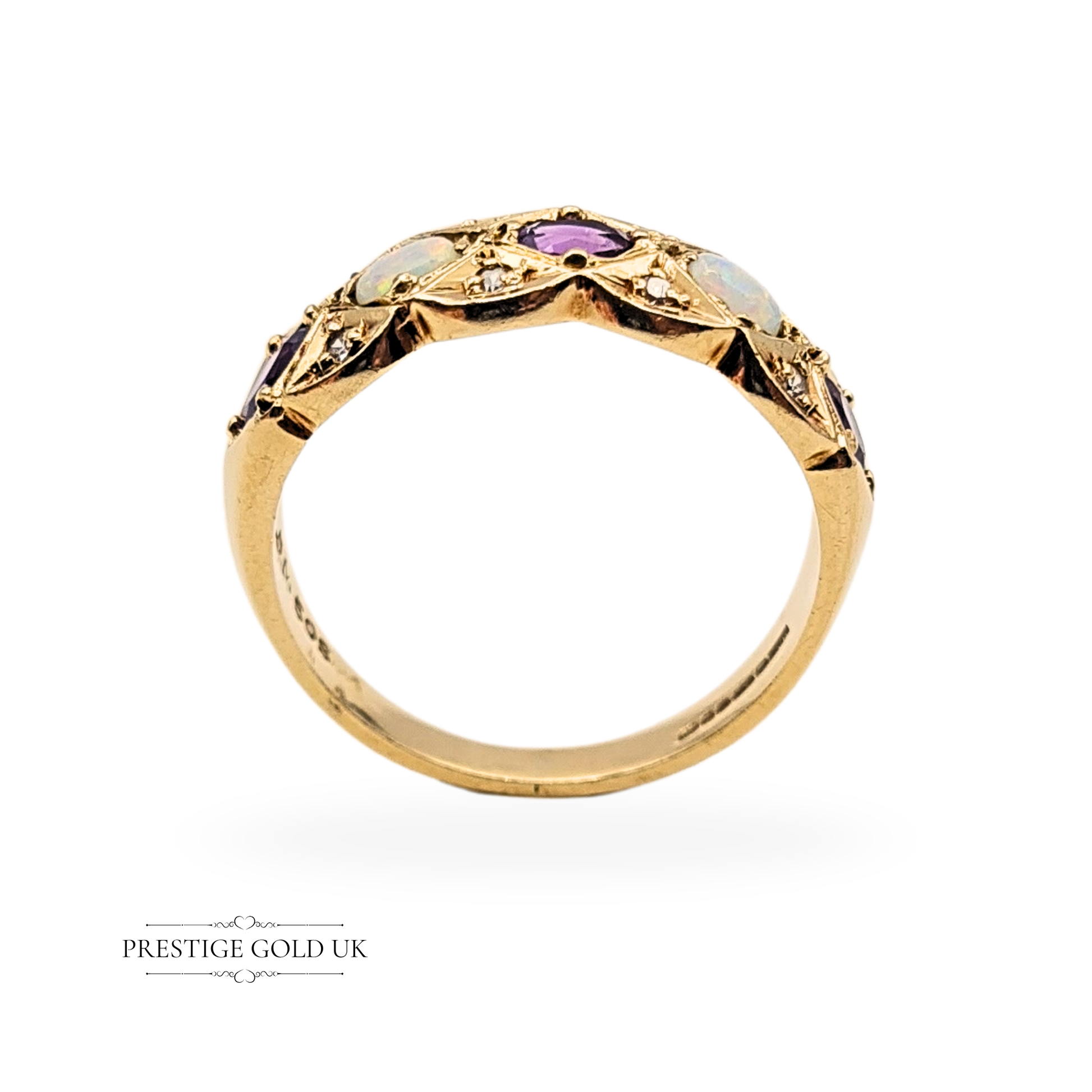 Hallmarked in Birmingham in 1969, this exquisite 9ct yellow gold ring showcases a beautiful arrangement of oval opals and round-cut amethysts framed by tiny accent diamonds. The stones are set in a diamond-patterned lattice, giving a soft geometric rhythm to the design while enhancing the play of colour from the opals and the regal depth of the amethysts. Only one available.