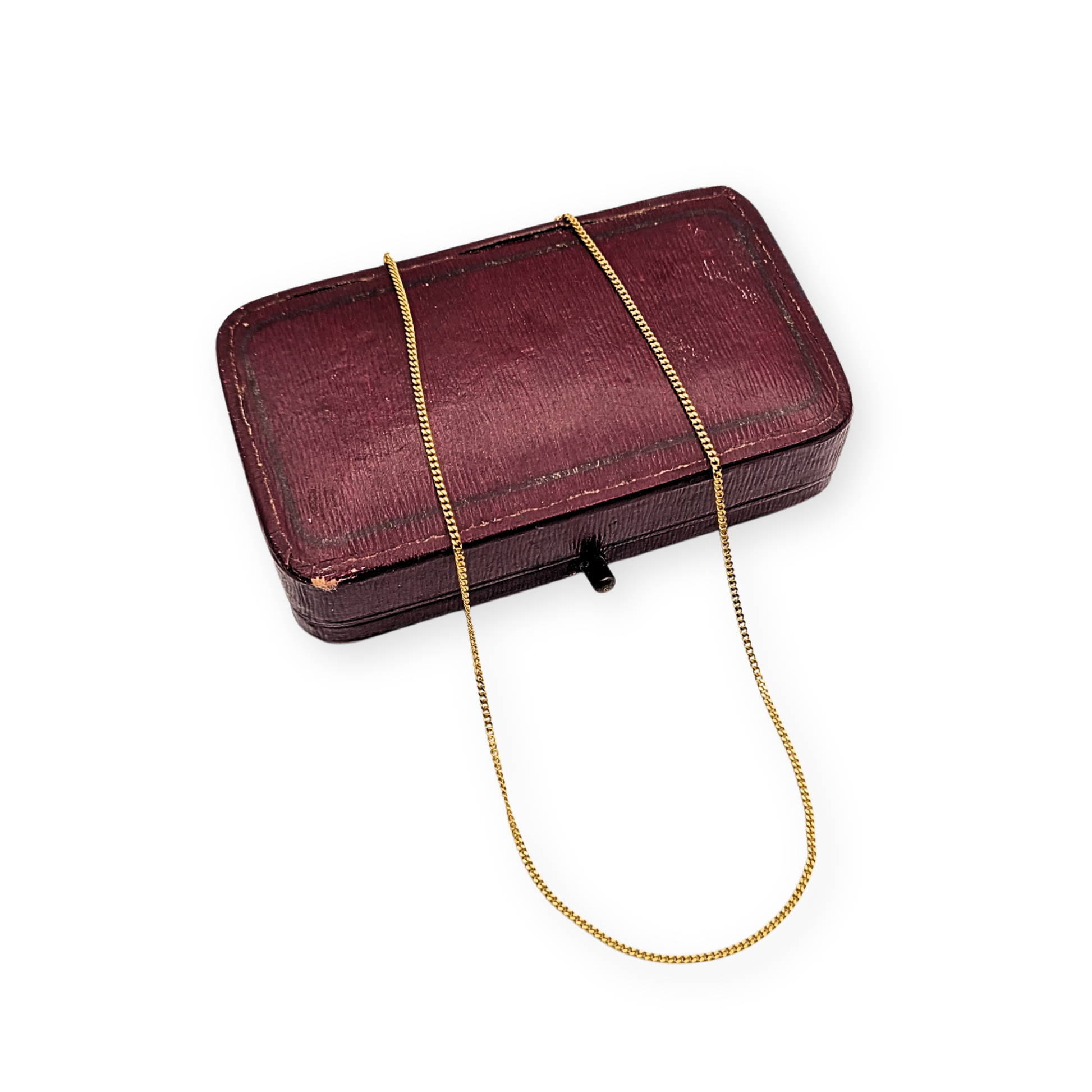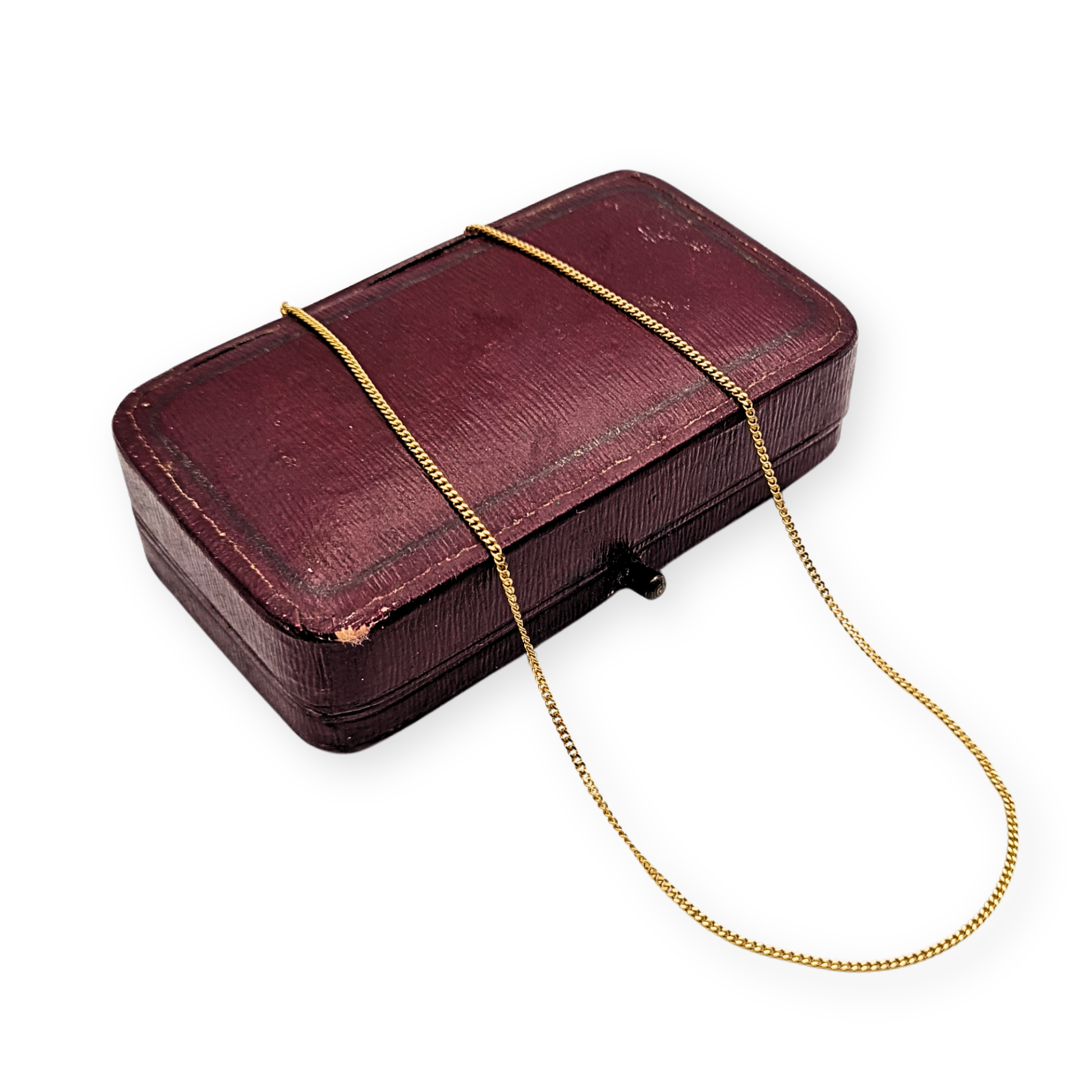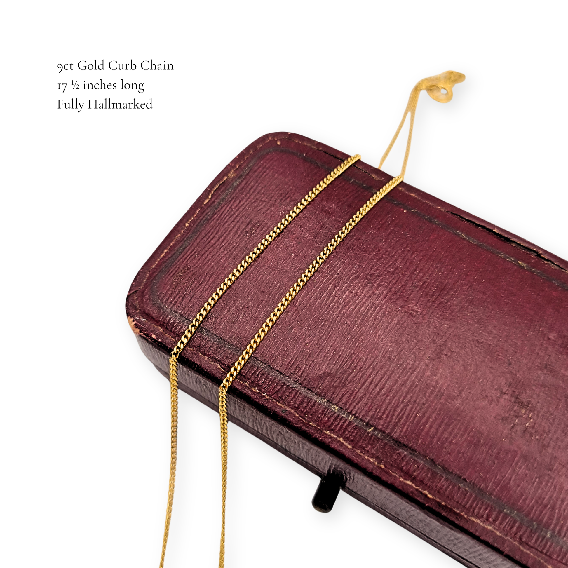 A delicate and refined 9ct solid gold curb chain measuring 17½ inches (45cm) in length with fine 1mm links and a secure spring ring clasp. Weighing 1.53g, this fully British hallmarked chain is ideal for lightweight pendants or layering.