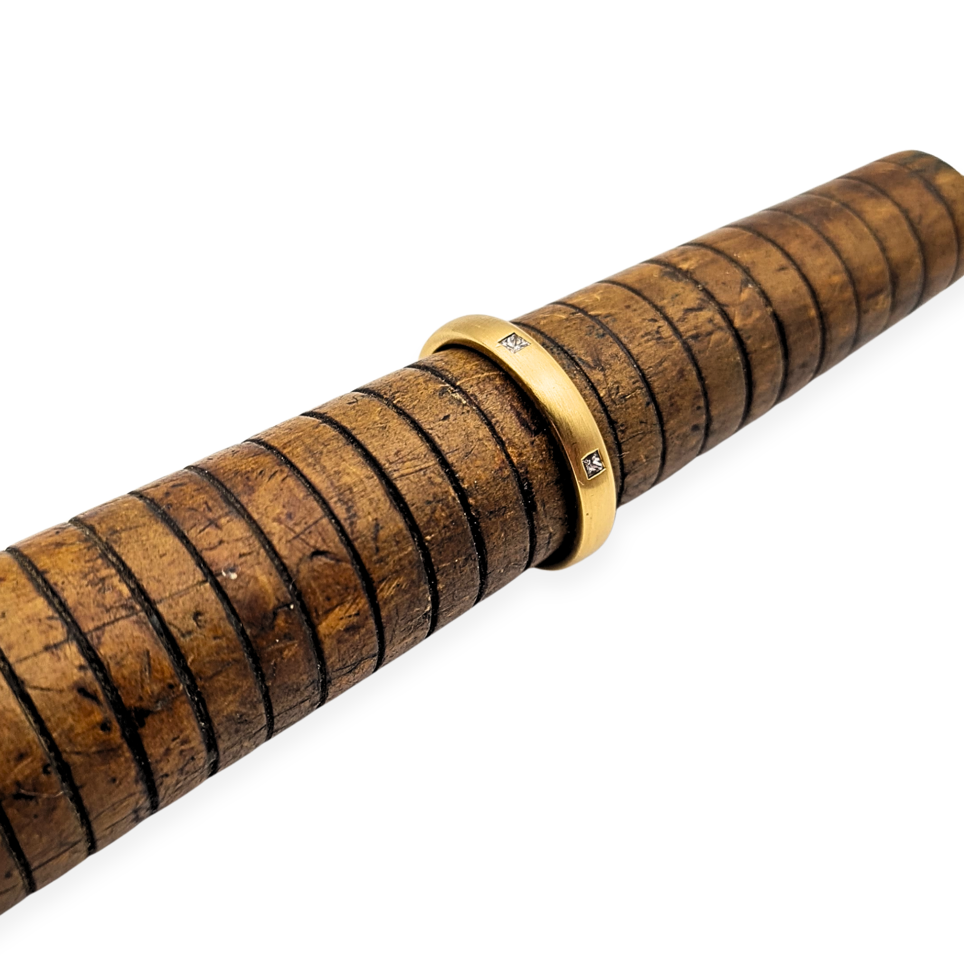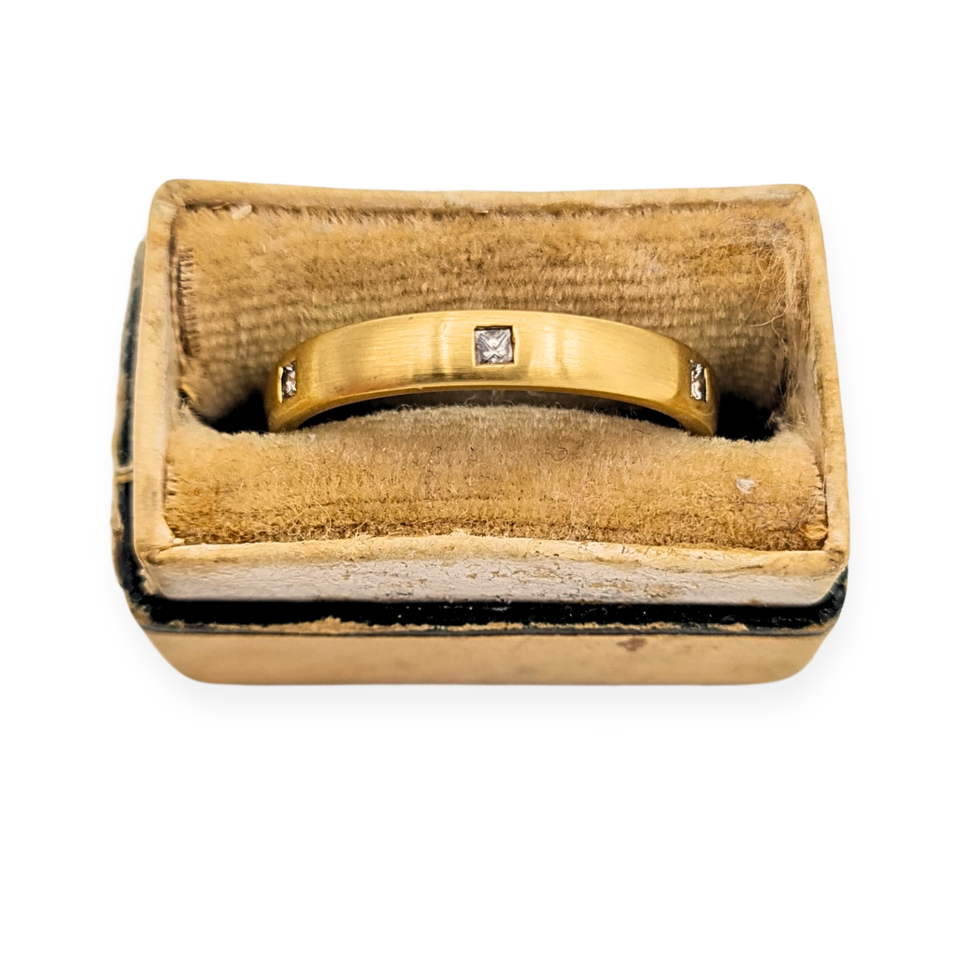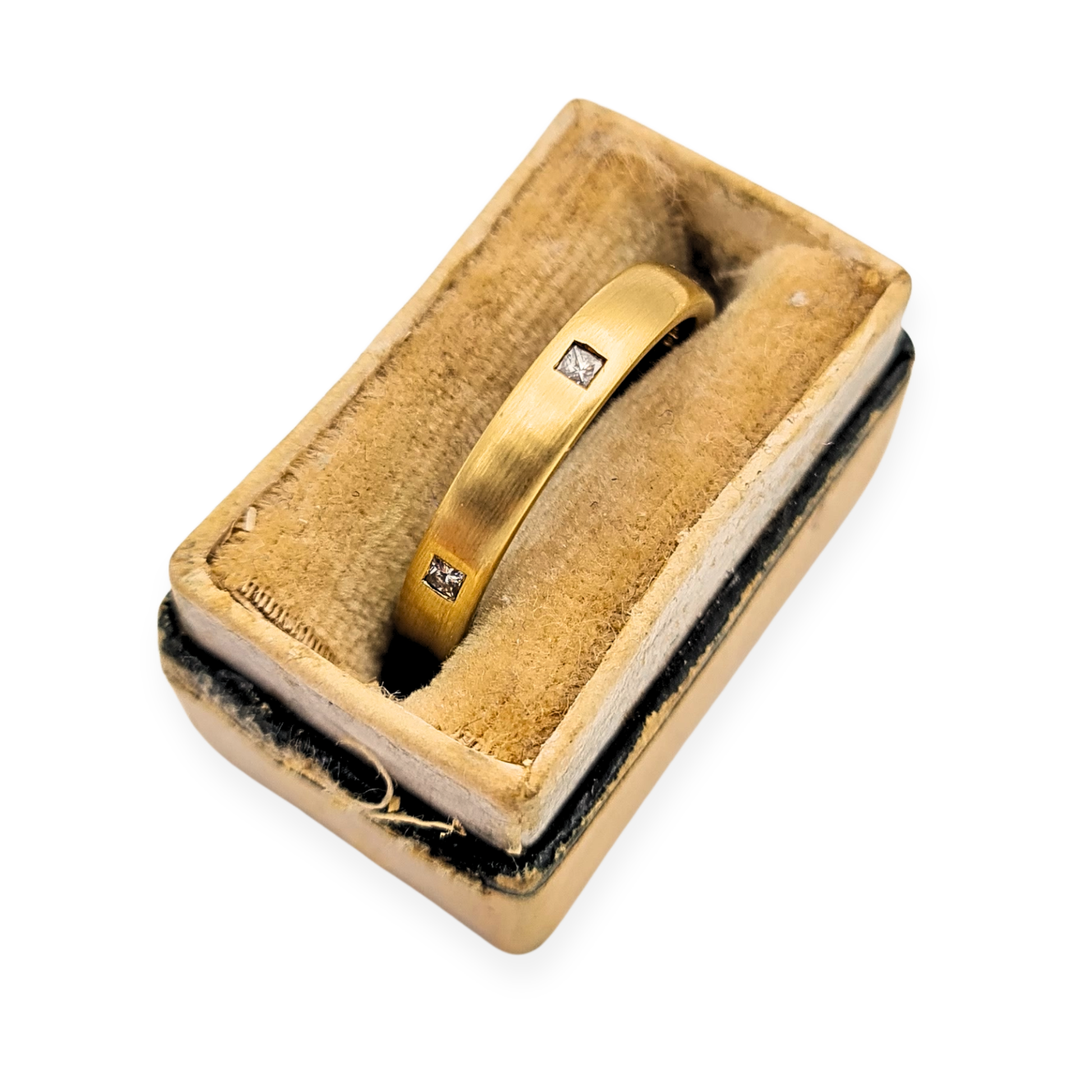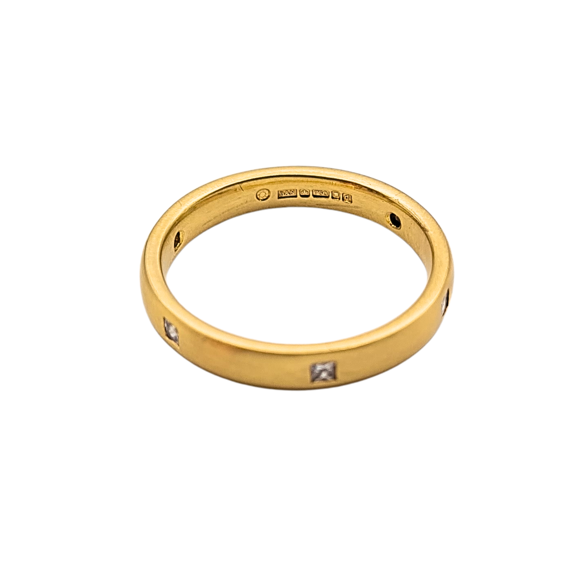 Bearing a London hallmark for 1959, this refined 18ct gold wedding band features six sparkling princess-cut diamonds evenly spaced around the brushed matte surface. Each diamond is neatly set within a square flush setting, balancing luxury with modern minimalism. The comfort-fit interior makes it an ideal daily wear band, while the substantial weight of 3.3g gives it a premium feel in hand. Elegant as a wedding ring, stacking piece, or understated statement band.