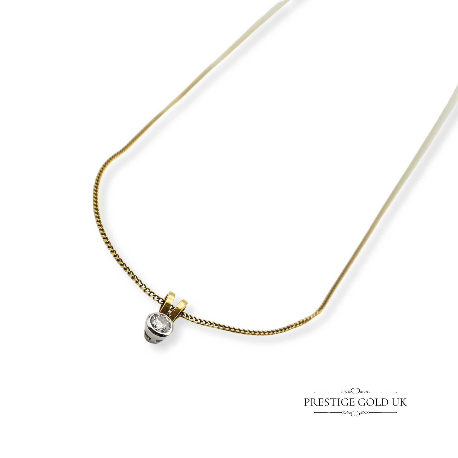 Hallmarked in London in 1995, this 18ct gold curb chain necklace features a dainty white gold pendant set with an estimated 0.1ct round cut diamond. The 17" chain is a fine 1mm width, fastening with a spring ring clasp, while the pendant measures 9mm tall by 4mm wide — a petite, elegant touch of sparkle perfect for layering or wearing alone. Only one available.