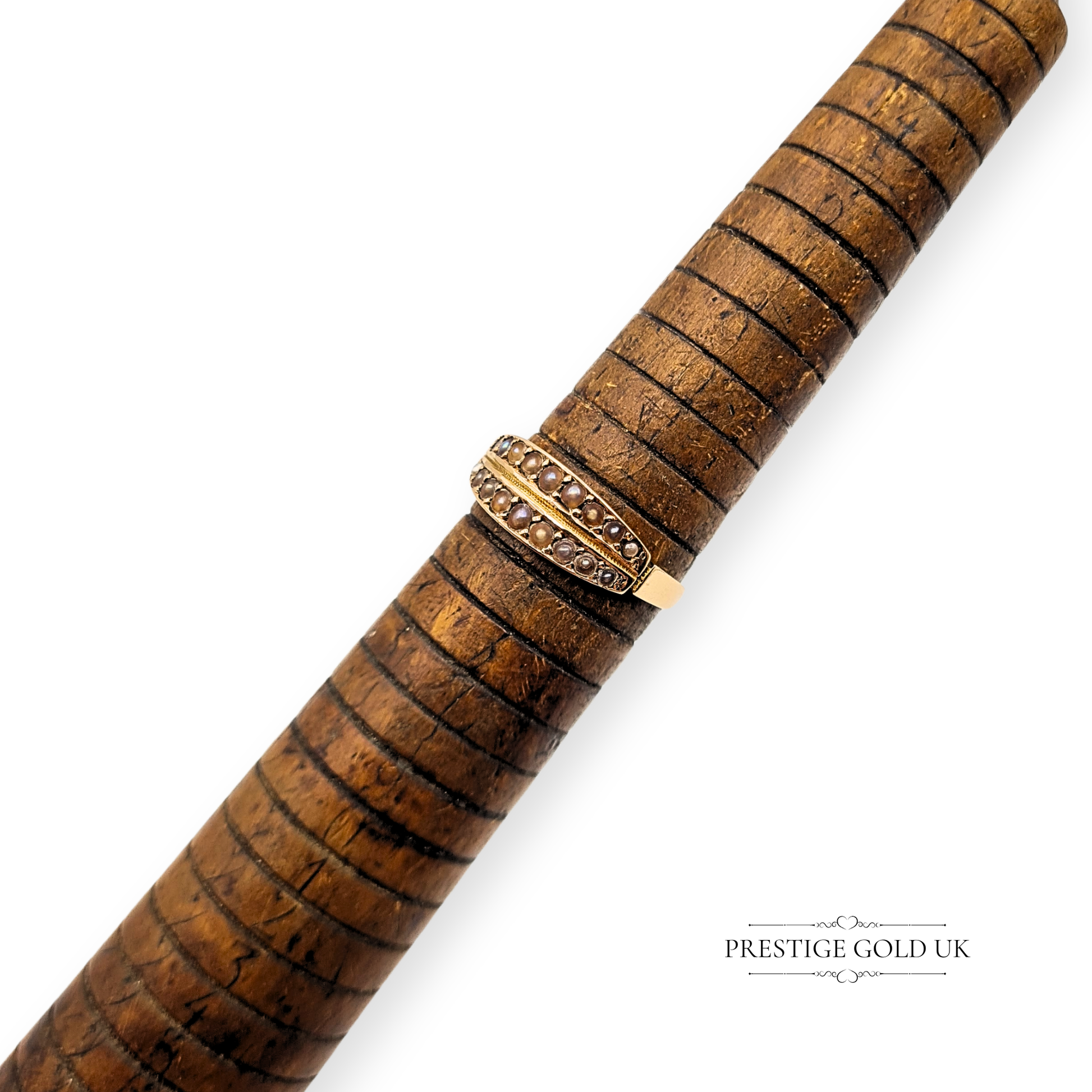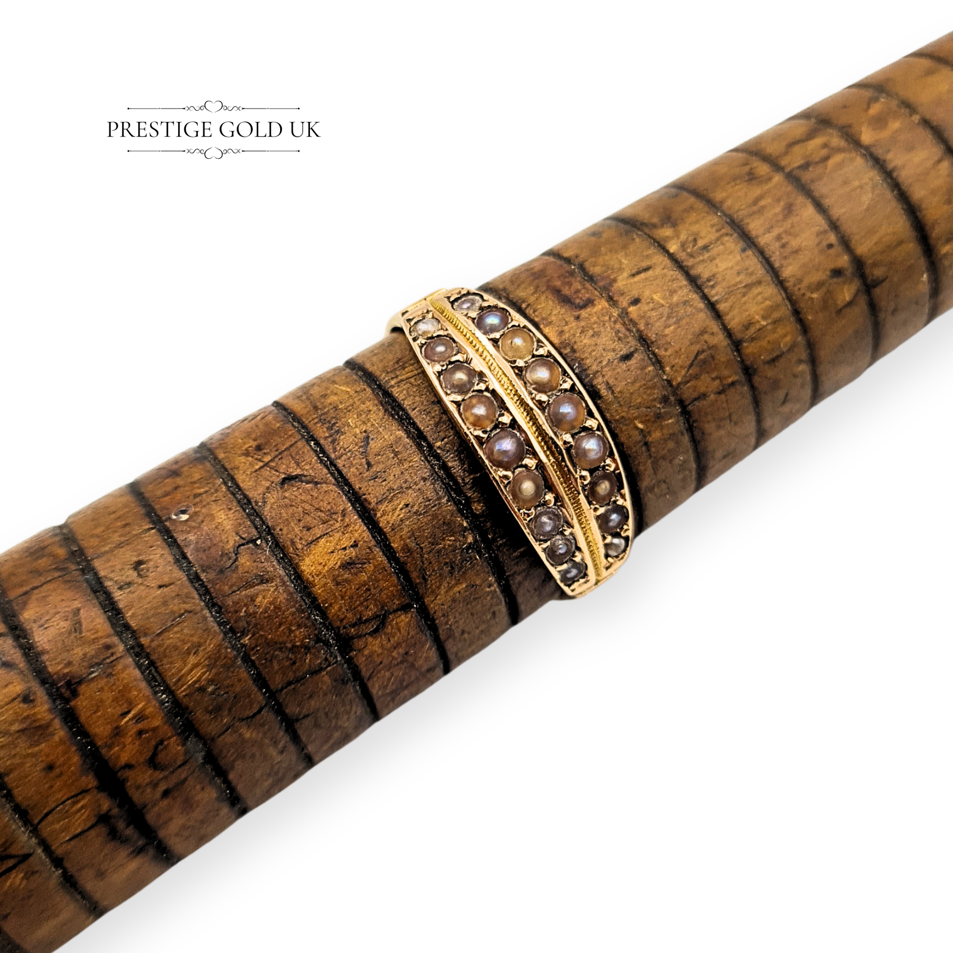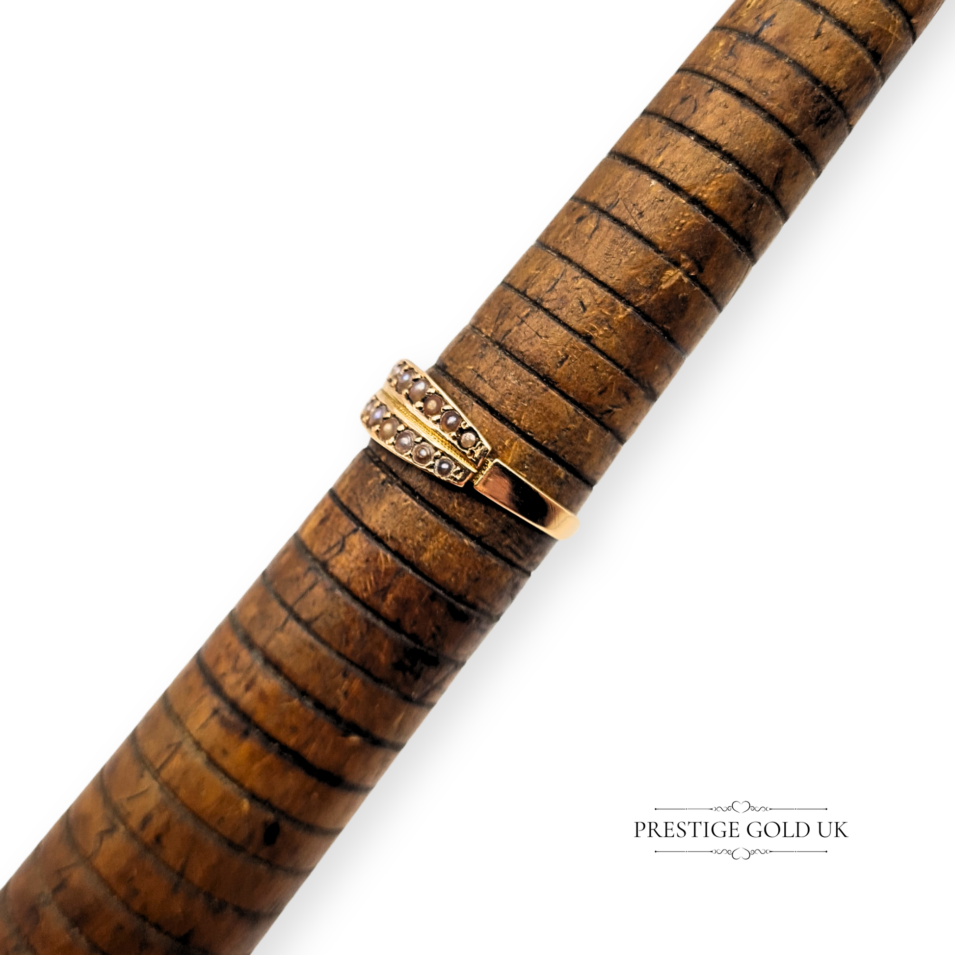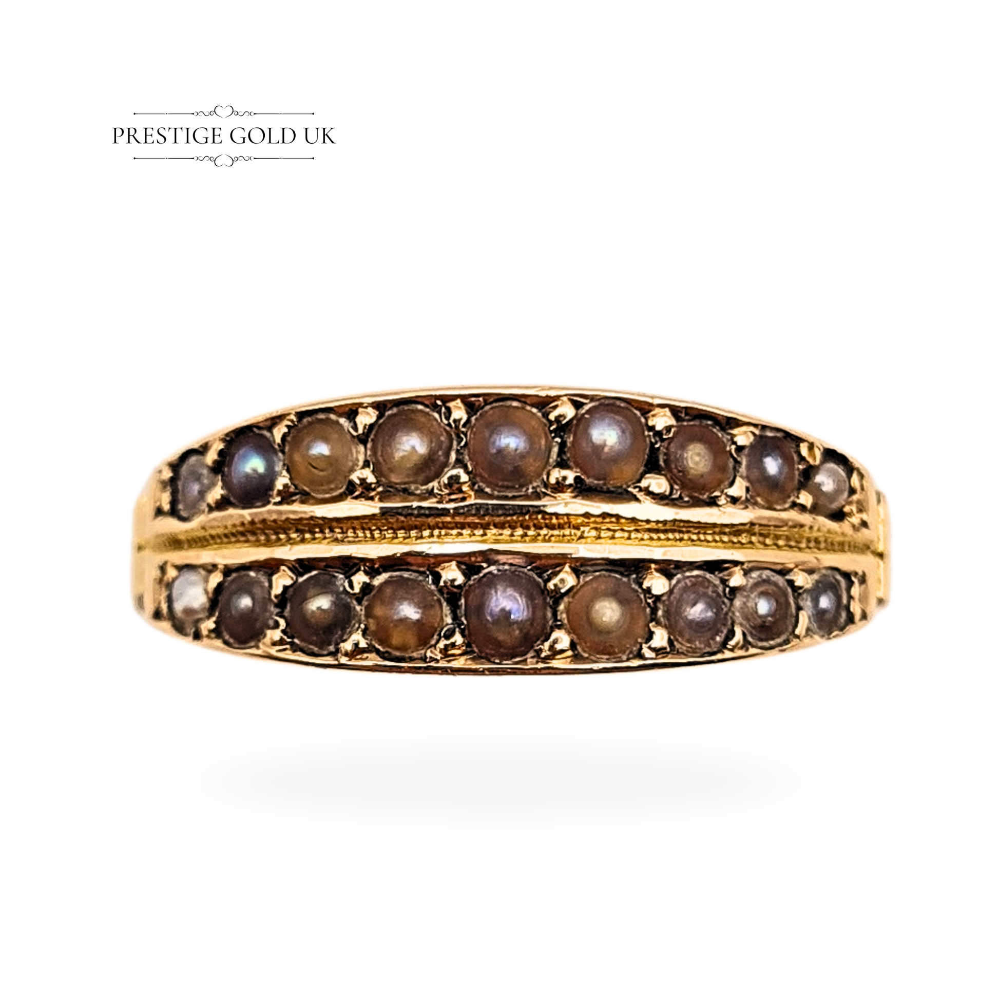 Hallmarked in Birmingham in 1880, this exquisite antique ring by Oetzmann & Co London is crafted in rich 15ct yellow gold and set with two elegant rows of natural seed pearls. Each lustrous pearl sits neatly within a milgrain-edged channel, the arrangement creating a soft, glowing symmetry across the finger. With its slender band and graceful profile, it wears beautifully as a statement of quiet refinement or as part of a period stack. Only one available.