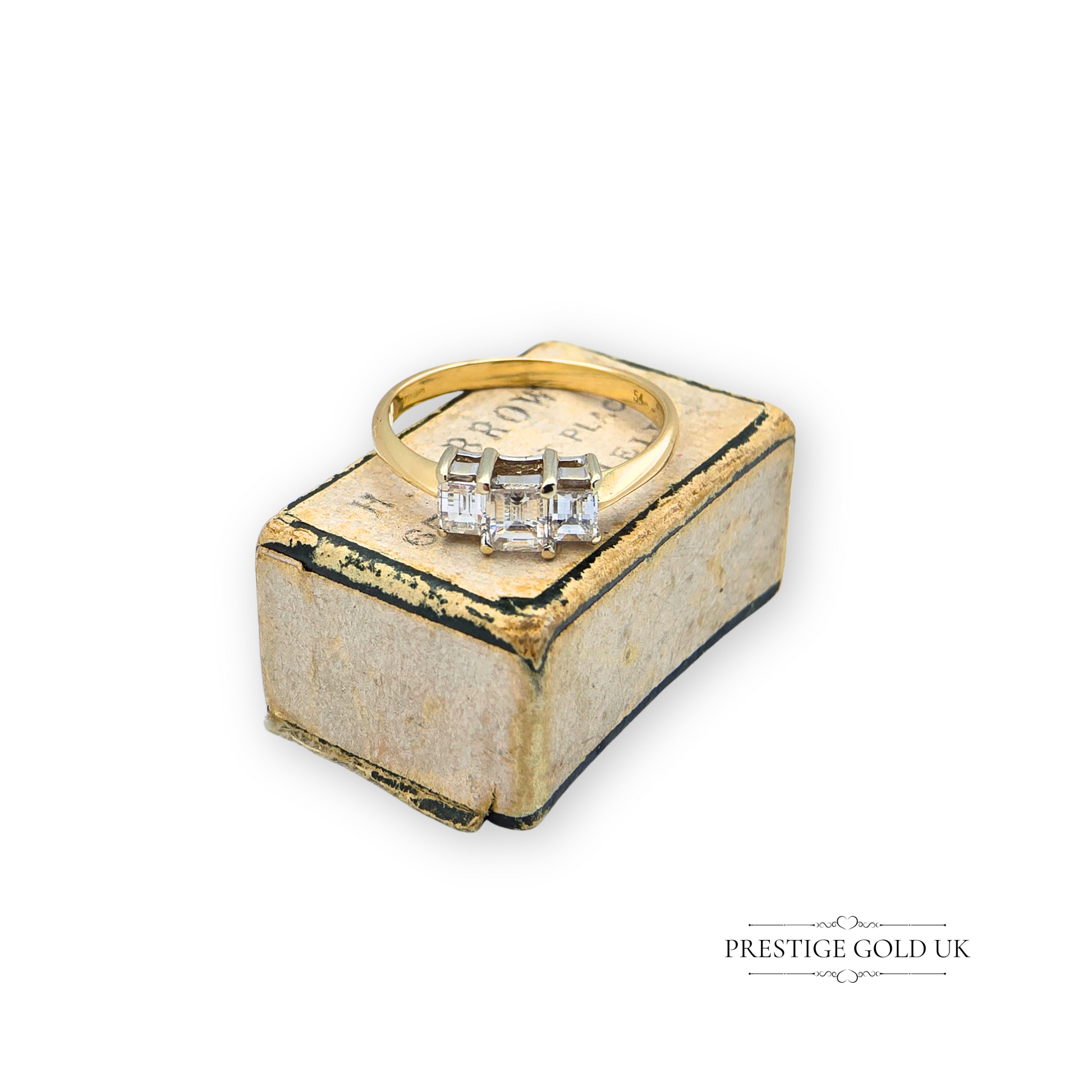 18ct yellow gold trilogy ring featuring three striking millennium cut princess diamonds, securely set in contrasting white gold claw settings. Fully hallmarked with a Birmingham import mark and dating to circa 1990, this sophisticated piece blends classic design with a modern touch. The crisp geometric sparkle of the millennium cuts is beautifully complemented by the warm hue of the yellow gold band. Perfect as an engagement ring, anniversary gift, or a timeless statement piece, this ring sits comfortably on the finger and radiates understated luxury.