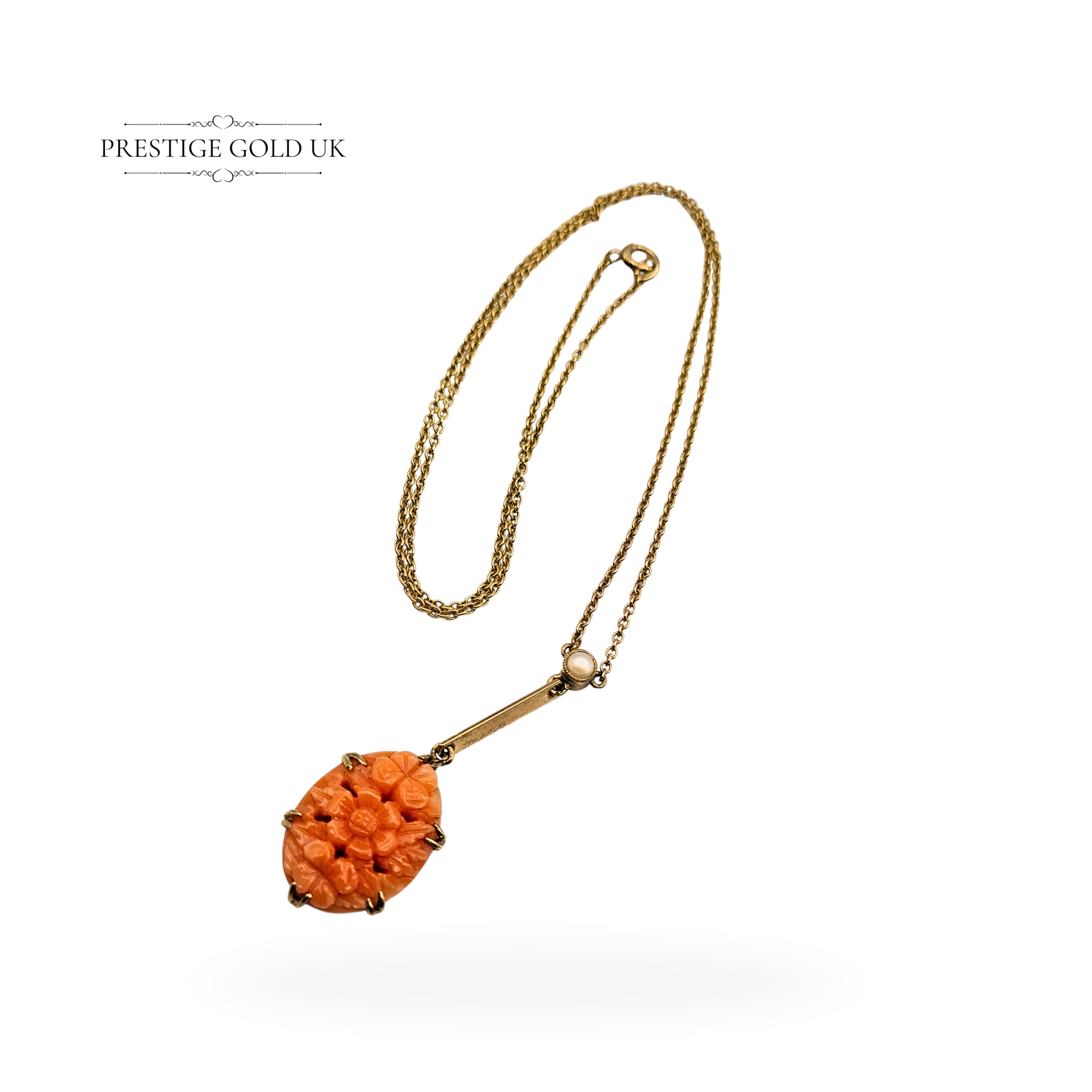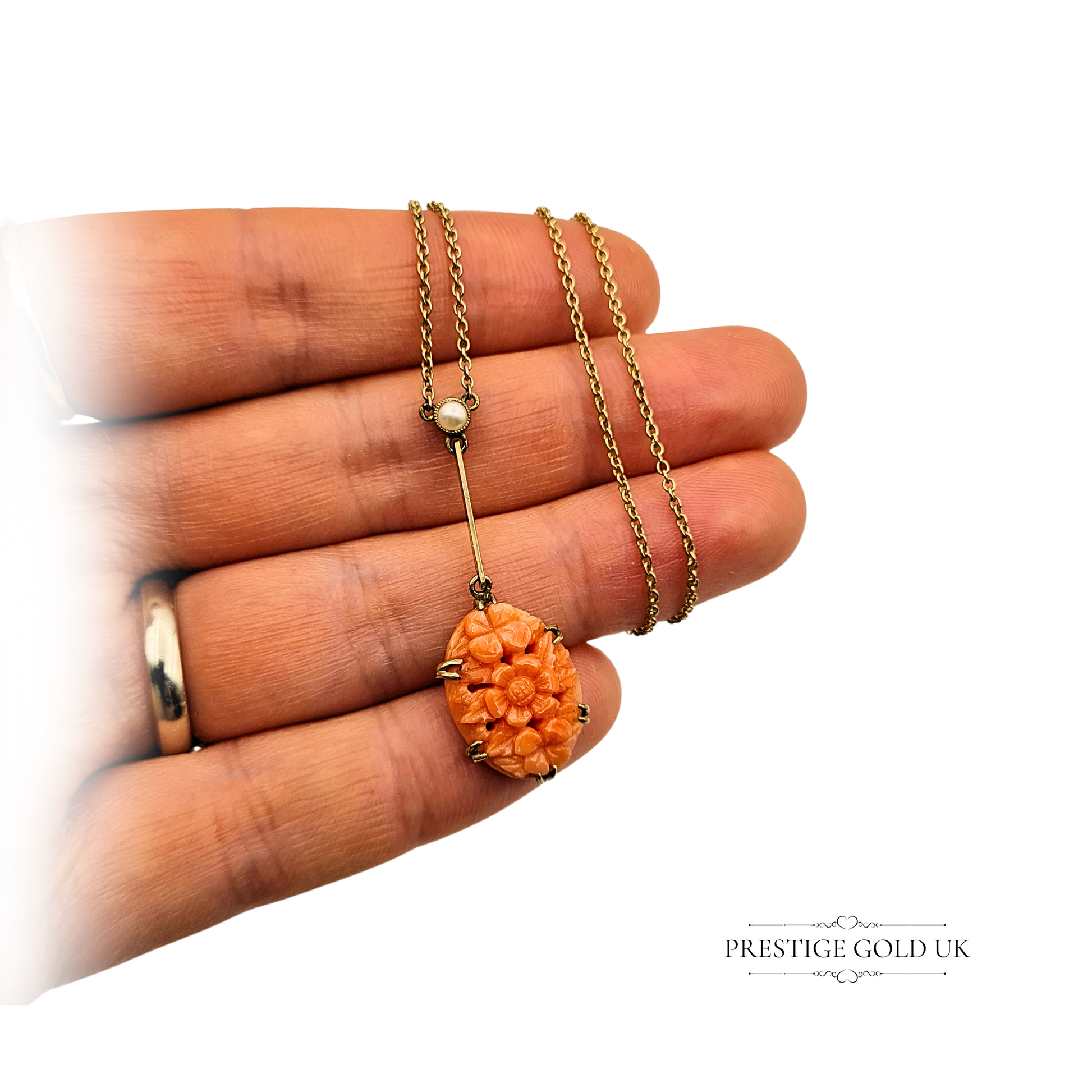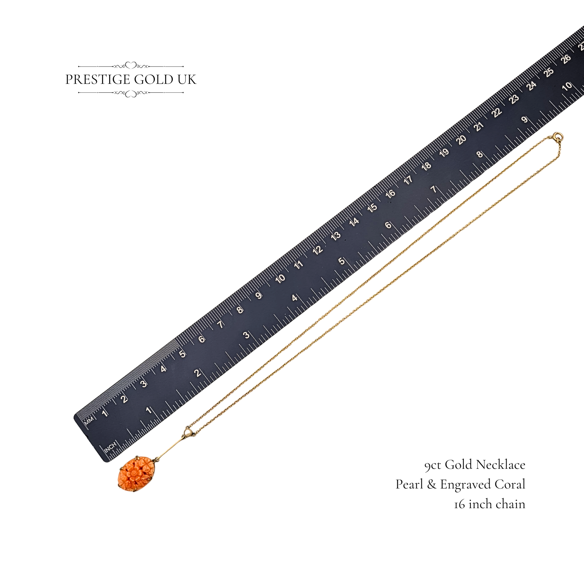 A beautifully detailed 9ct gold necklace featuring a hand-engraved coral floral pendant suspended from a petite bar set with a single seed pearl. The pendant measures approximately 34mm from the top of the pearl to the base of the coral, paired with a fine 16-inch (41cm) gold chain. Weighing 3.30g and tested as 9ct gold, this piece captures the refined elegance of Edwardian style jewellery design, with its rich coral tones and delicate goldwork. Only one available.