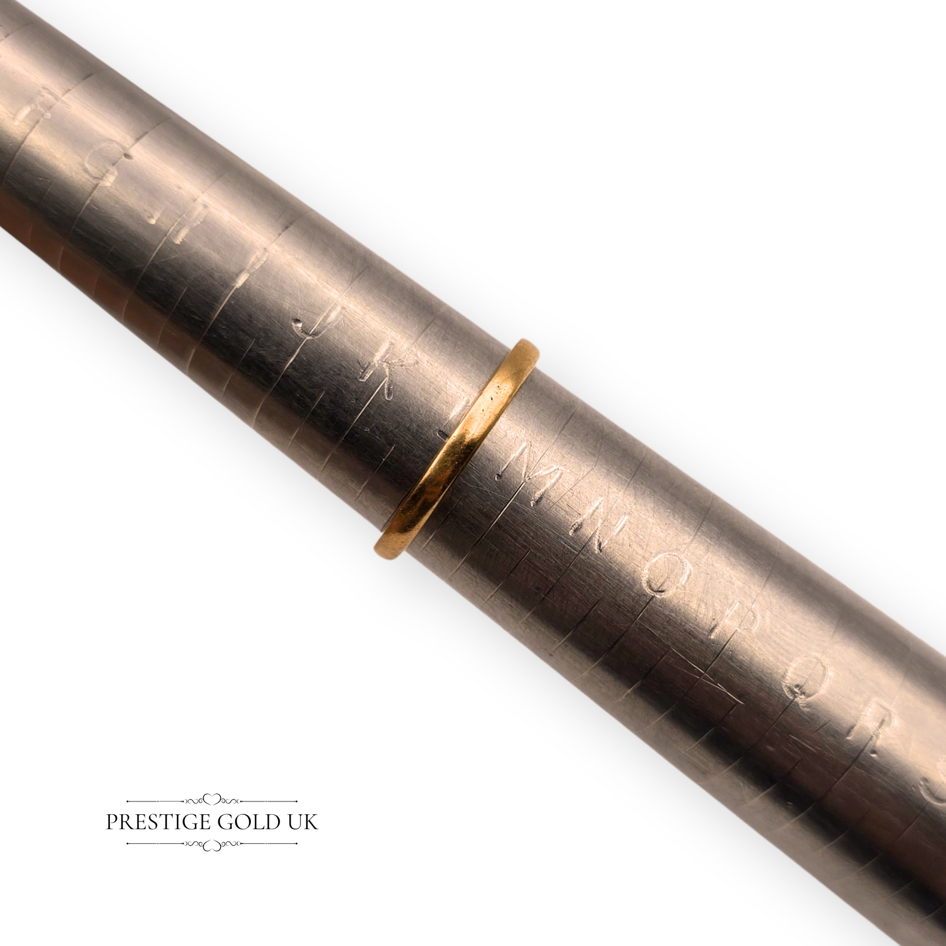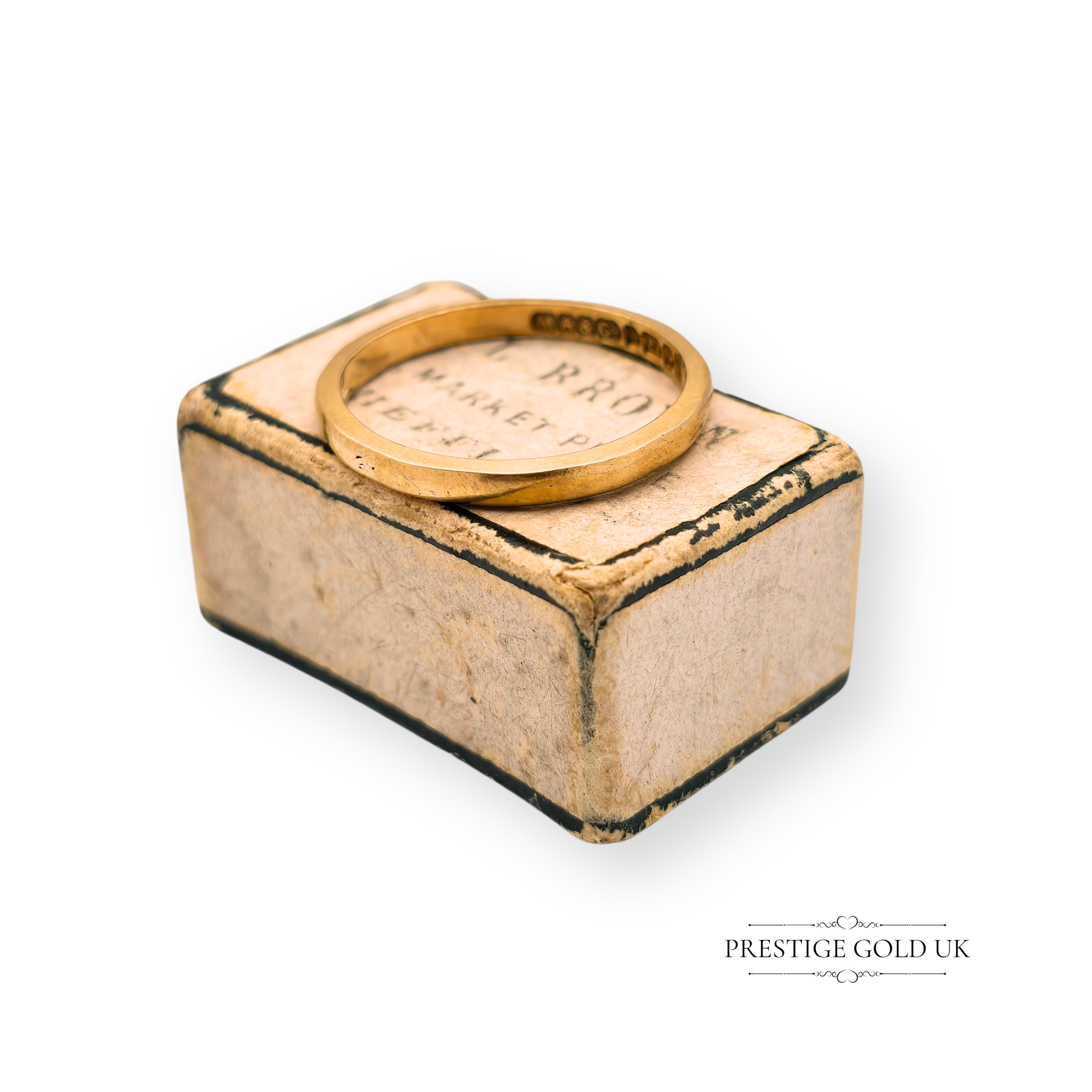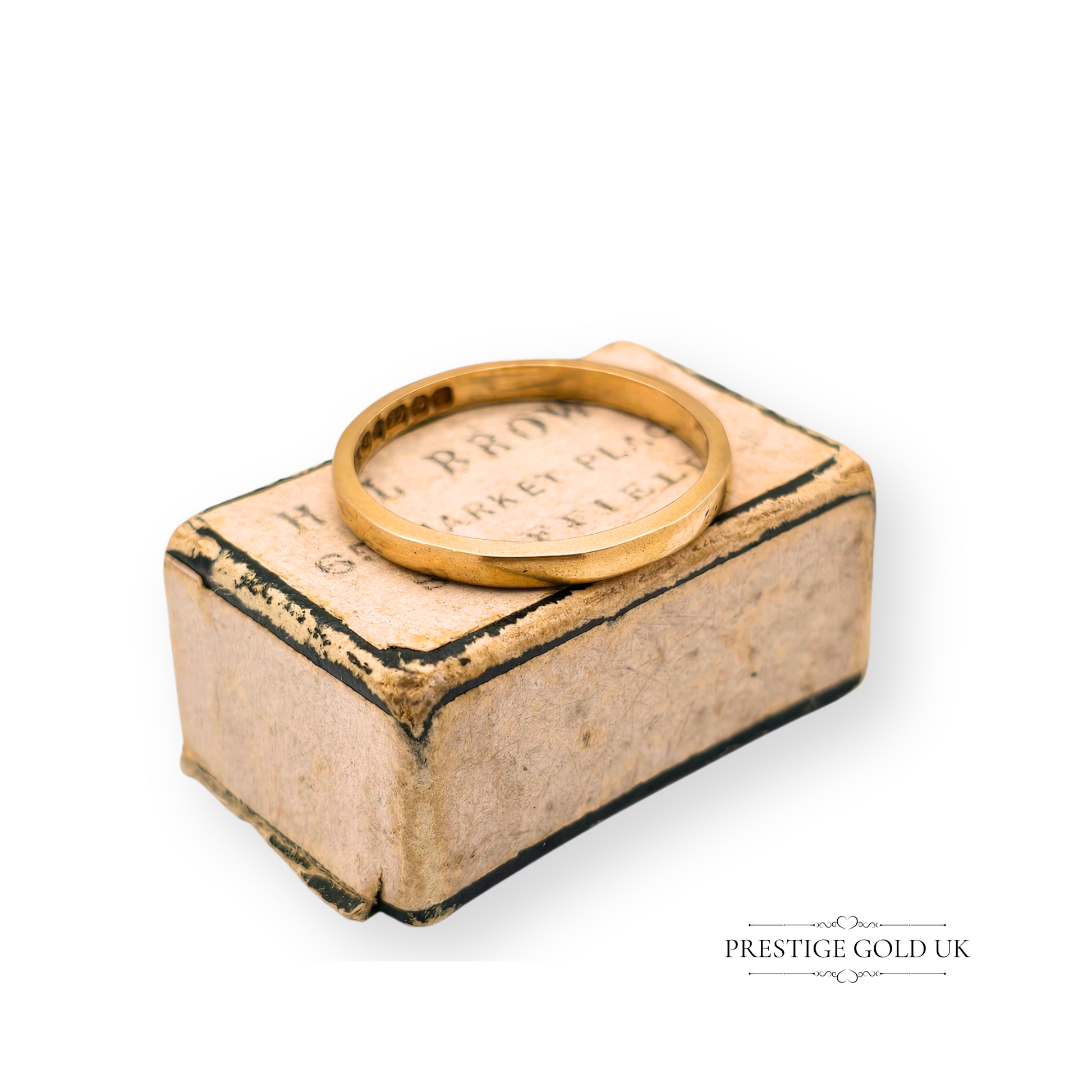 A beautifully elegant vintage 22ct gold wedding band, crafted by renowned maker MA&Co and fully hallmarked at the Birmingham Assay Office in 1949. This timeless piece features, faceted flat edges and a slender 2mm width, offering a refined, minimalist profile with a distinctive mid-century charm. The rich, buttery yellow of high-purity 22ct gold pairs beautifully with the tactile, angular edges that catch the light subtly with every movement. A wonderful heirloom-quality piece from the late 1940s, ideal as a wedding ring, stacking ring, or meaningful gift. Fully hallmarked to confirm its purity, maker, date, and British origin.