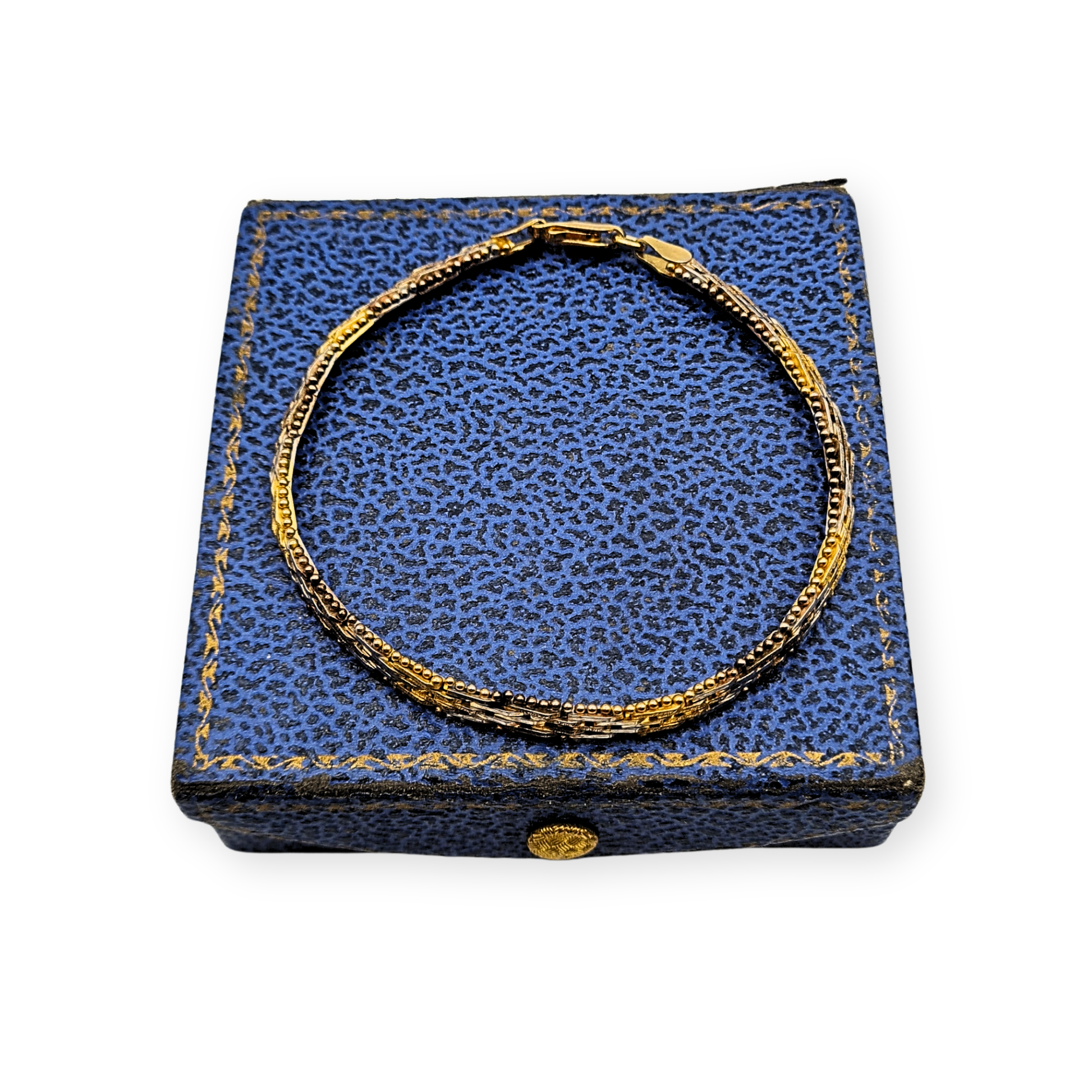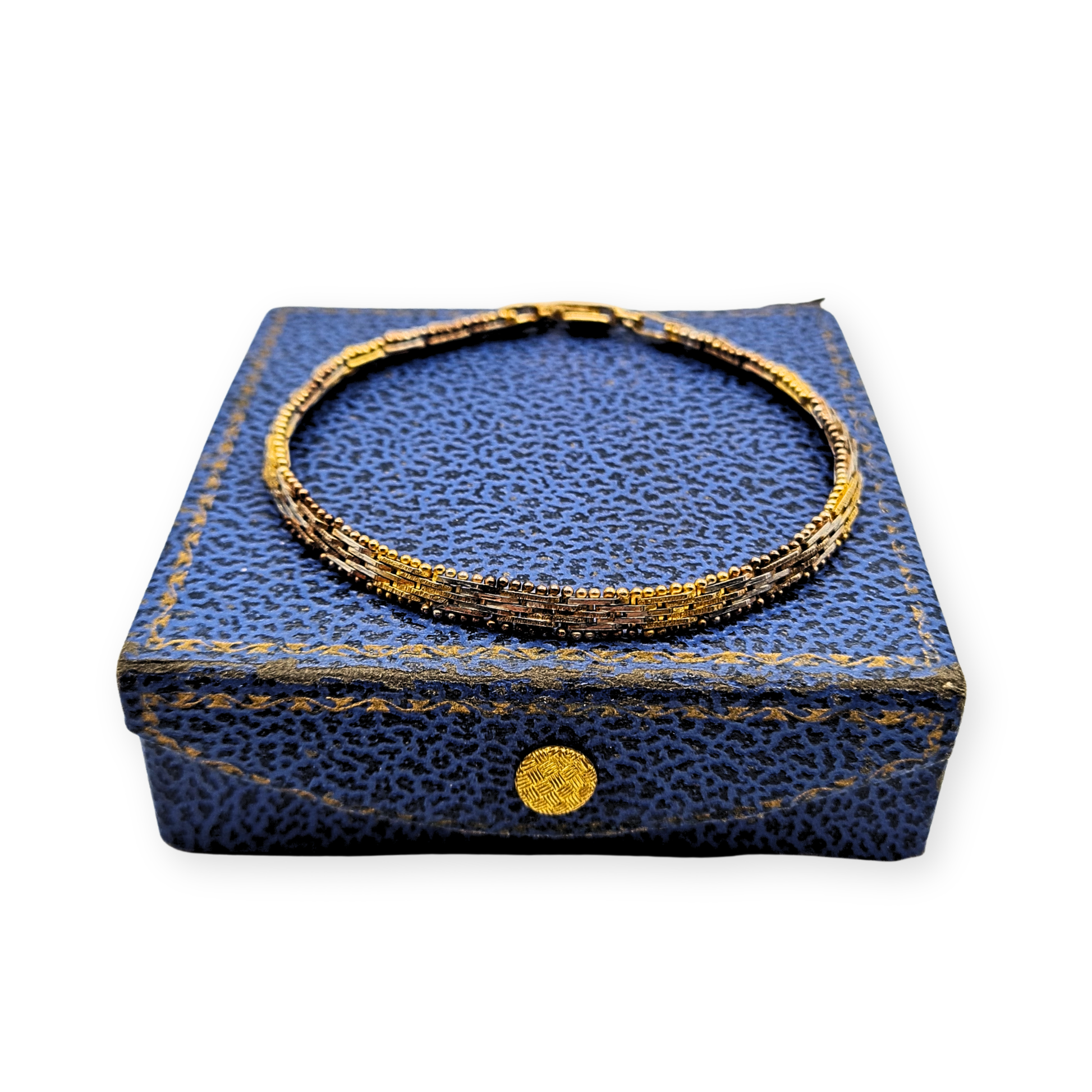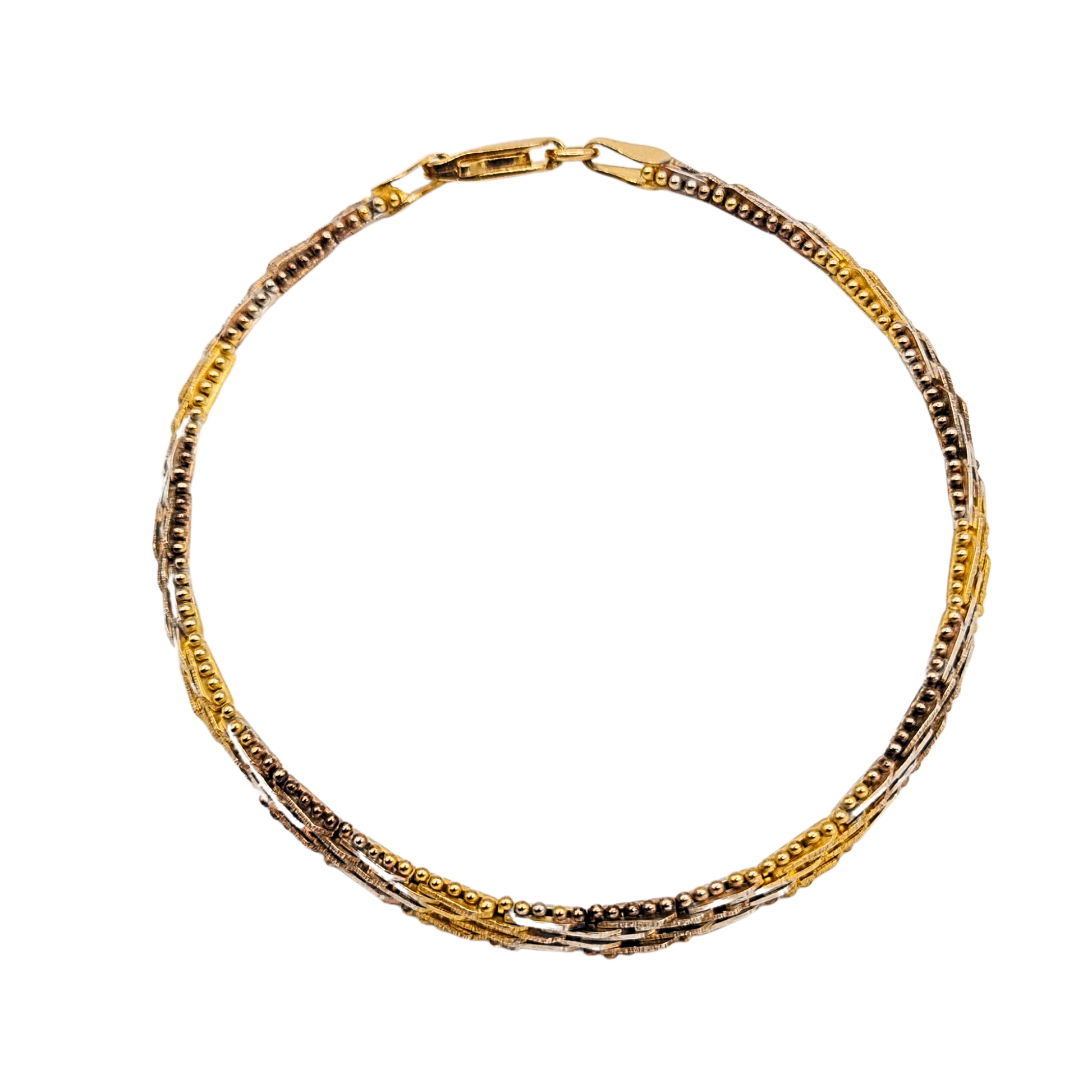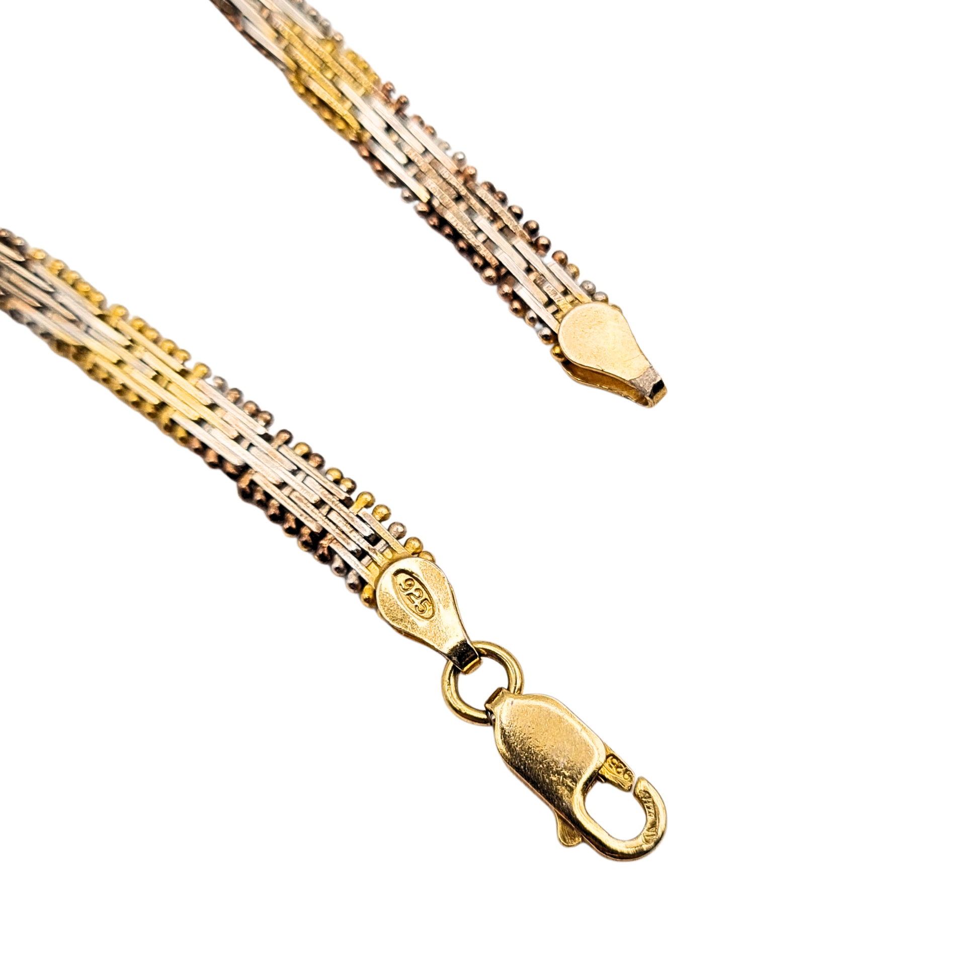 Stamped 925 and weighing 8.65g, this sterling silver bracelet features an elegant three-tone finish of yellow, rose, and white silver. Measuring 7.5 inches long and 4.5mm wide, its intricate multi-row design with beaded edges gives it both texture and sophistication. The colours subtly shimmer together, creating a rich yet versatile piece suitable for daily wear or special occasions. A secure lobster clasp ensures comfortable fastening. Only one available.
