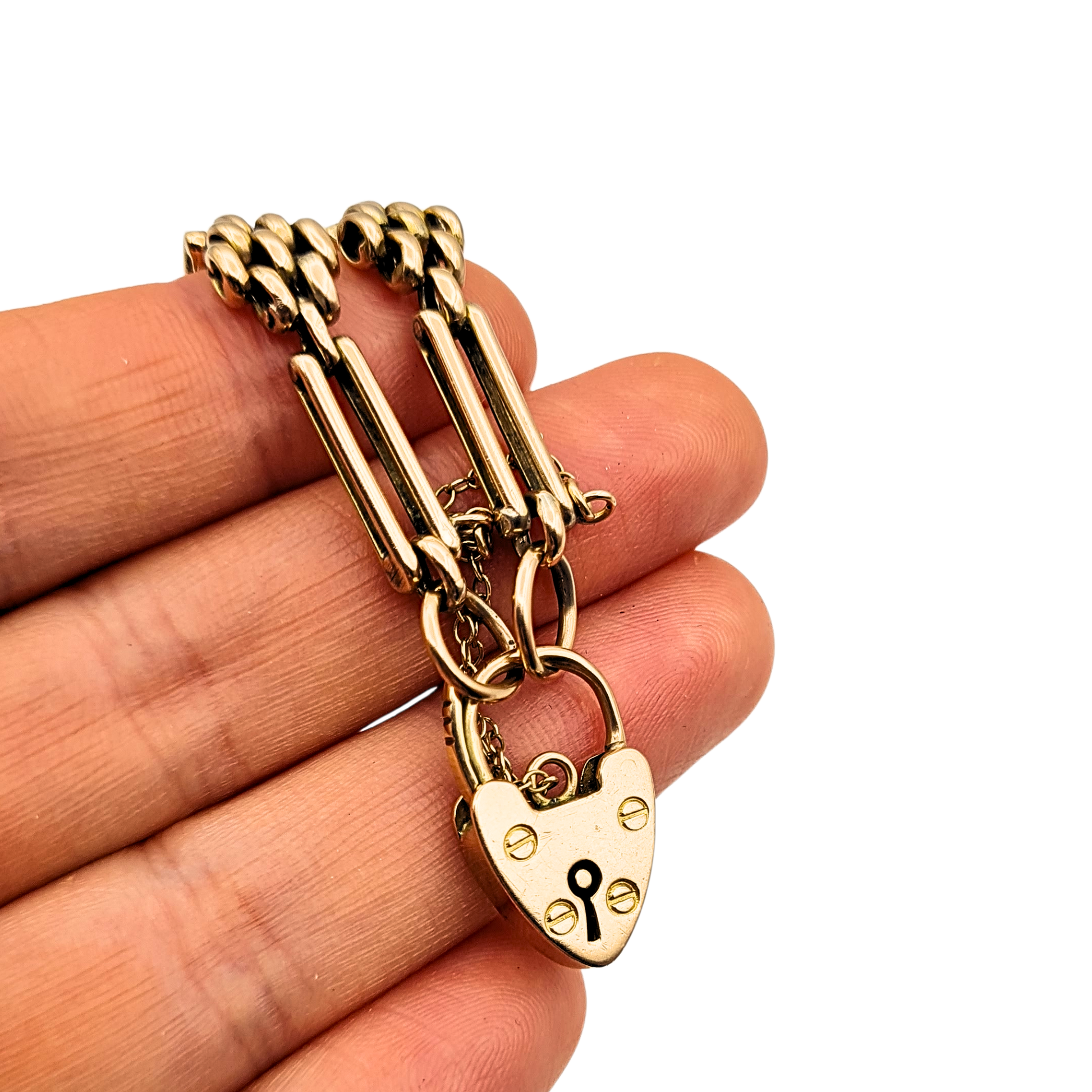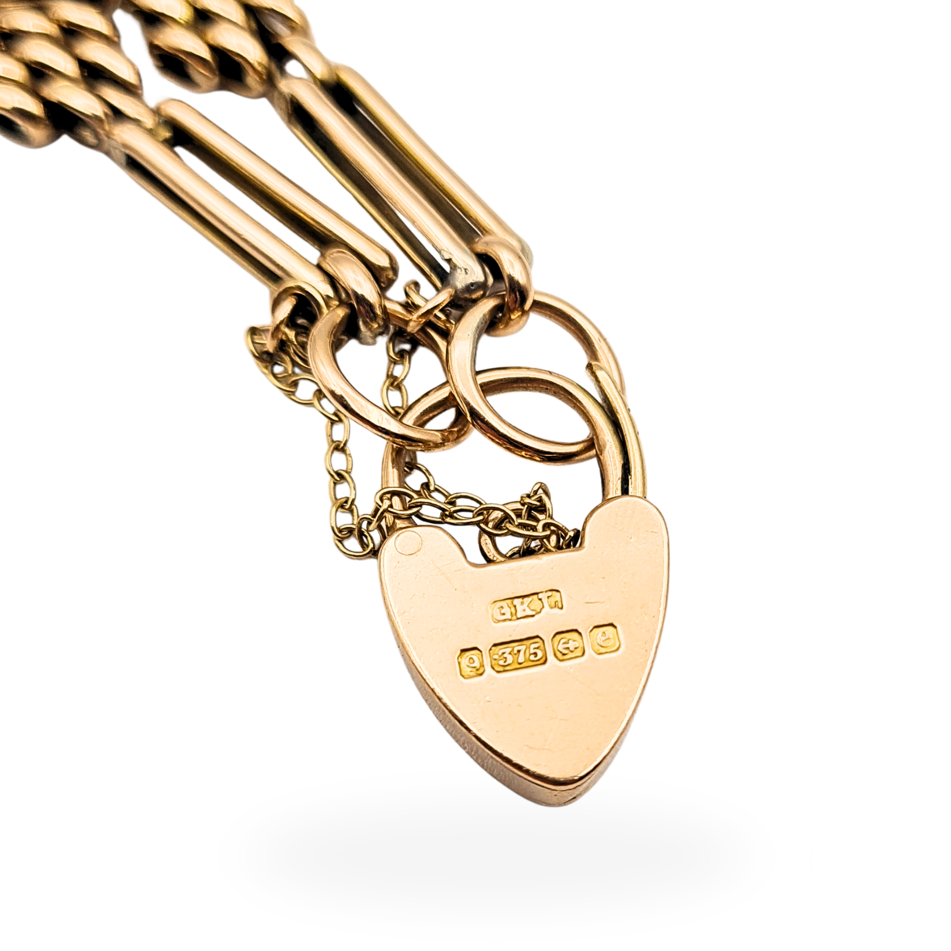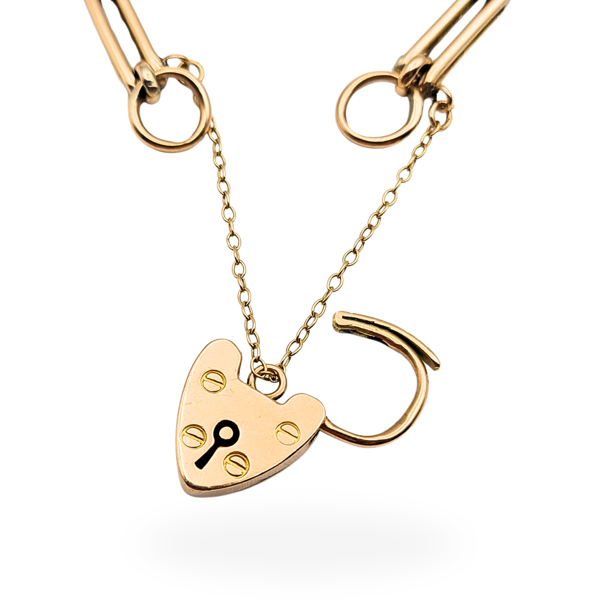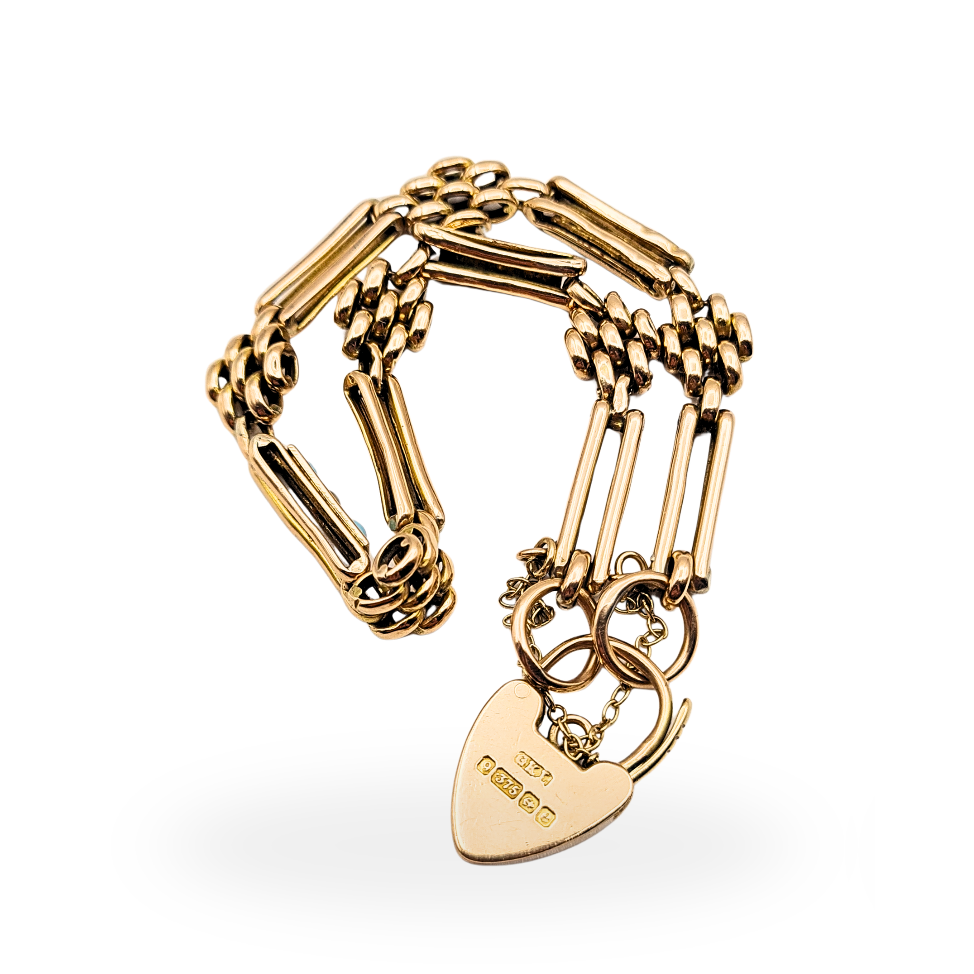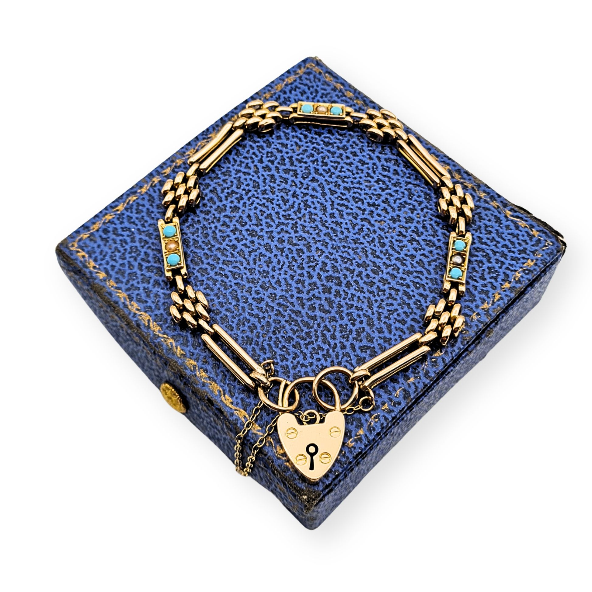 Hallmarked in Birmingham in 1904, this beautiful antique bracelet is crafted in solid 9ct rose gold and set with alternating turquoise and seed pearls. Its narrow gate-link design gives a wonderfully refined profile, measuring 12mm wide and 7½ inches long, secured with a traditional heart-shaped padlock clasp and safety chain. The natural turquoise stones bring soft blue tones that contrast gently against the mellow gold, complemented by lustrous seed pearls typical of Edwardian finery. A true period piece with elegant character — note some light flattening to the underside of a few links from gentle historic wear, visible in photos but not affecting structure or wearability. A rare find that wears gracefully and layers beautifully with bangles or a watch.