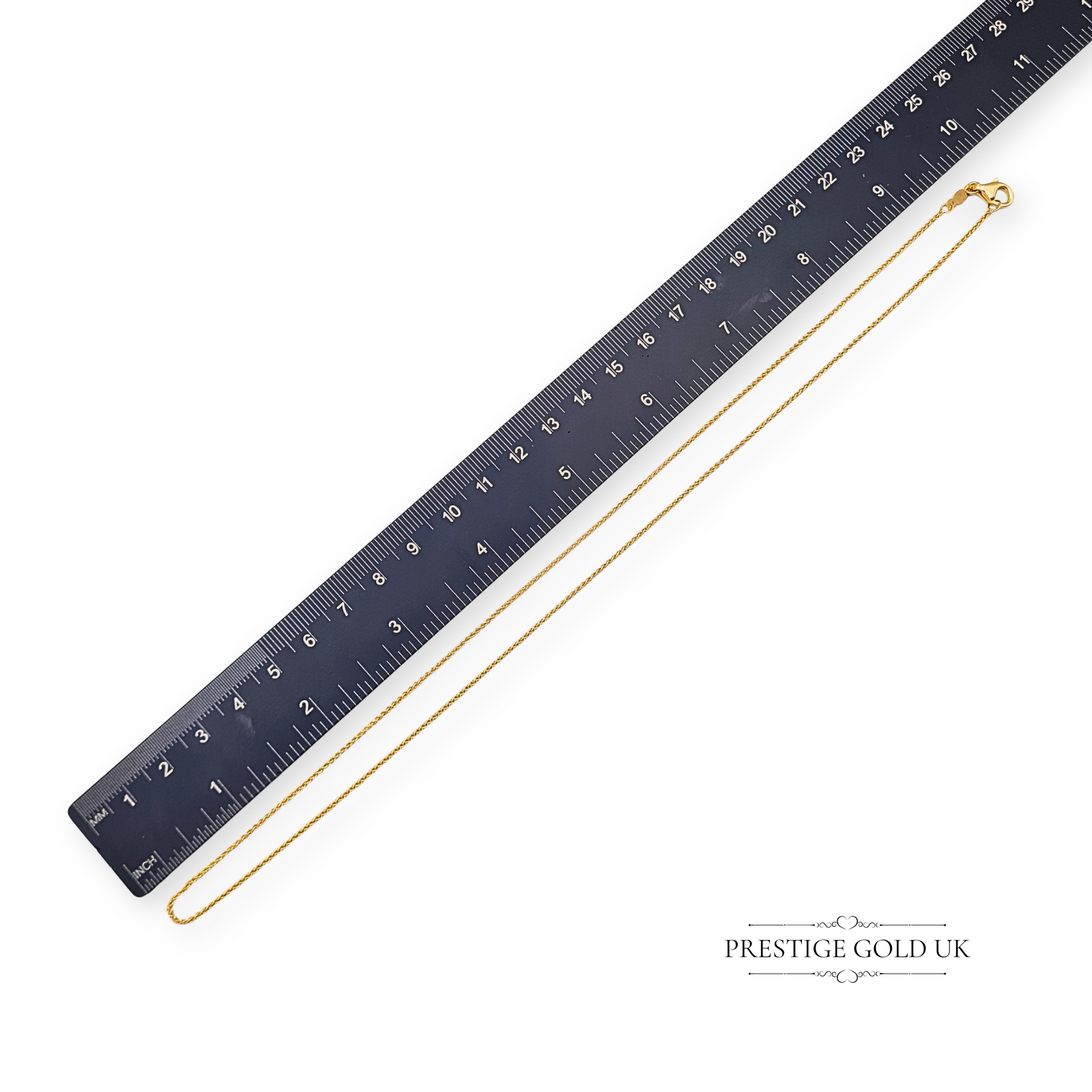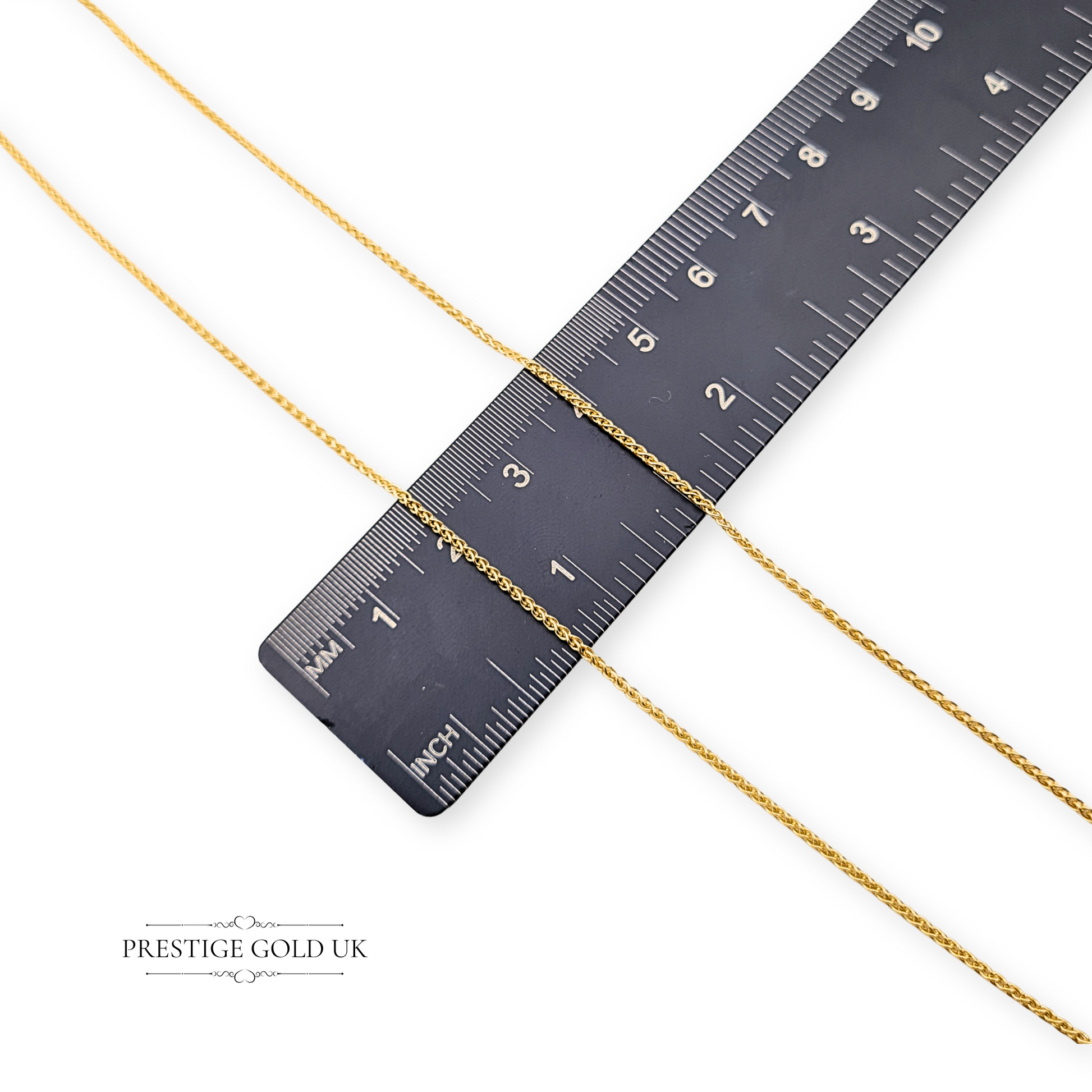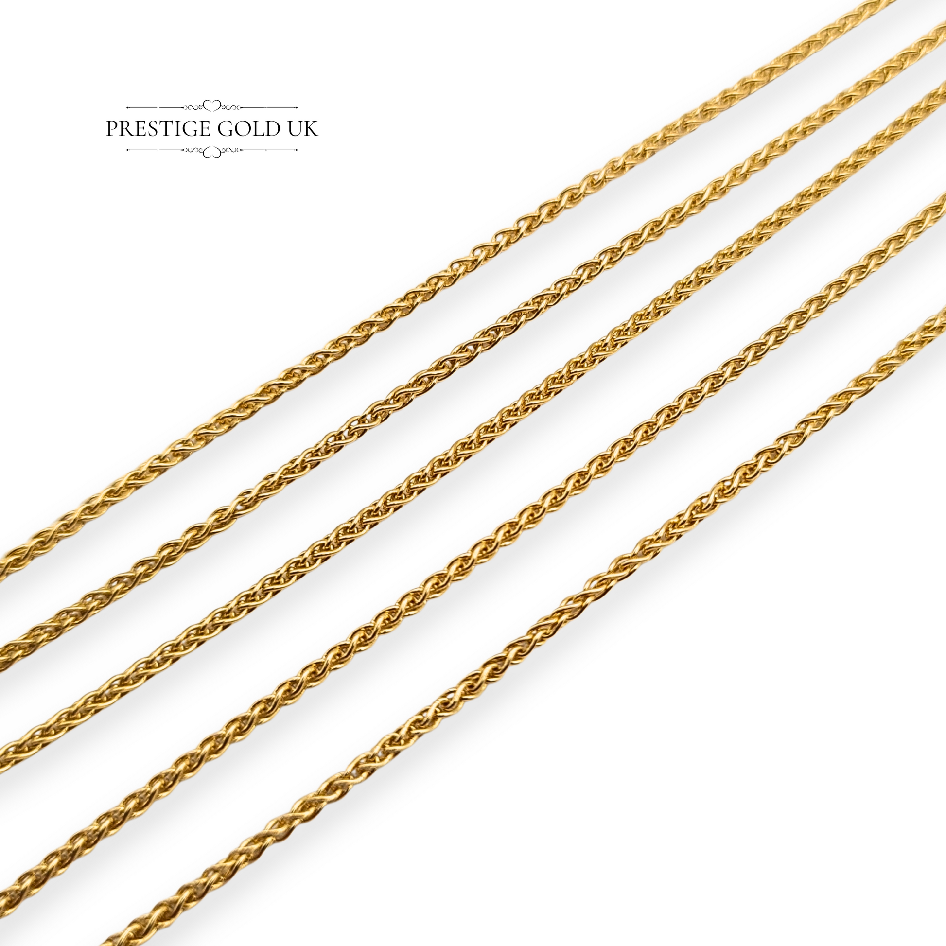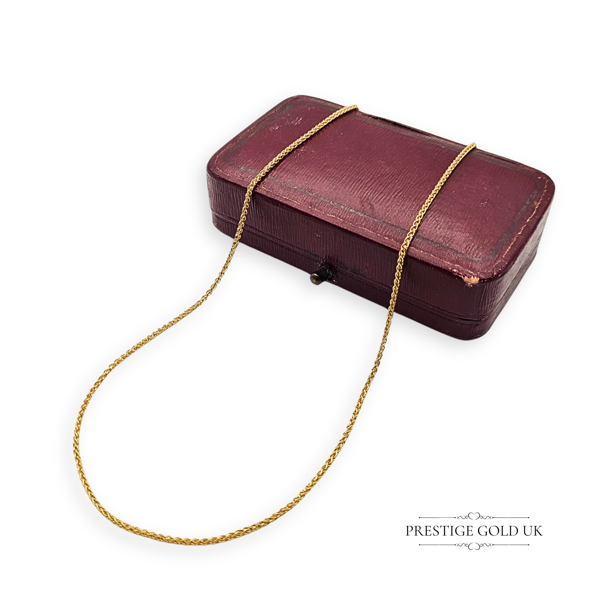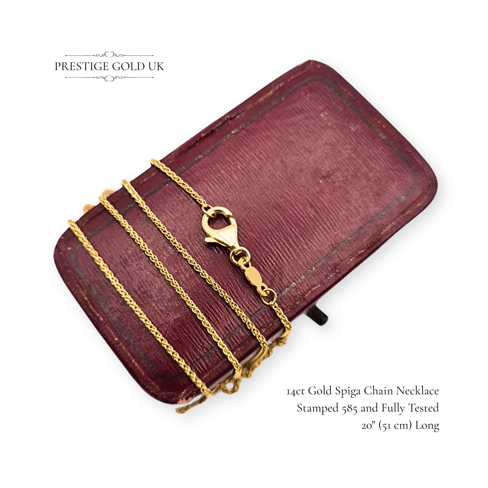 Stamped 585 and fully tested, this solid 14ct gold spiga chain necklace weighs 3.5g and measures 20 inches (51cm) long with a slim 1.2mm width. Its intricate spiga (wheat) links create a subtle rope-like effect, adding texture and elegance while remaining lightweight and versatile. Secured with a sturdy lobster clasp, this necklace balances delicacy with durability, perfect for everyday wear or layering with pendants. A beautifully made piece in real gold, suitable for men or women. Only one available.