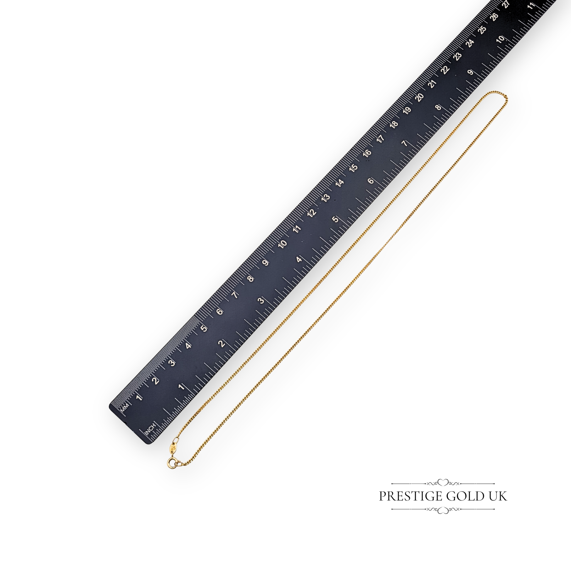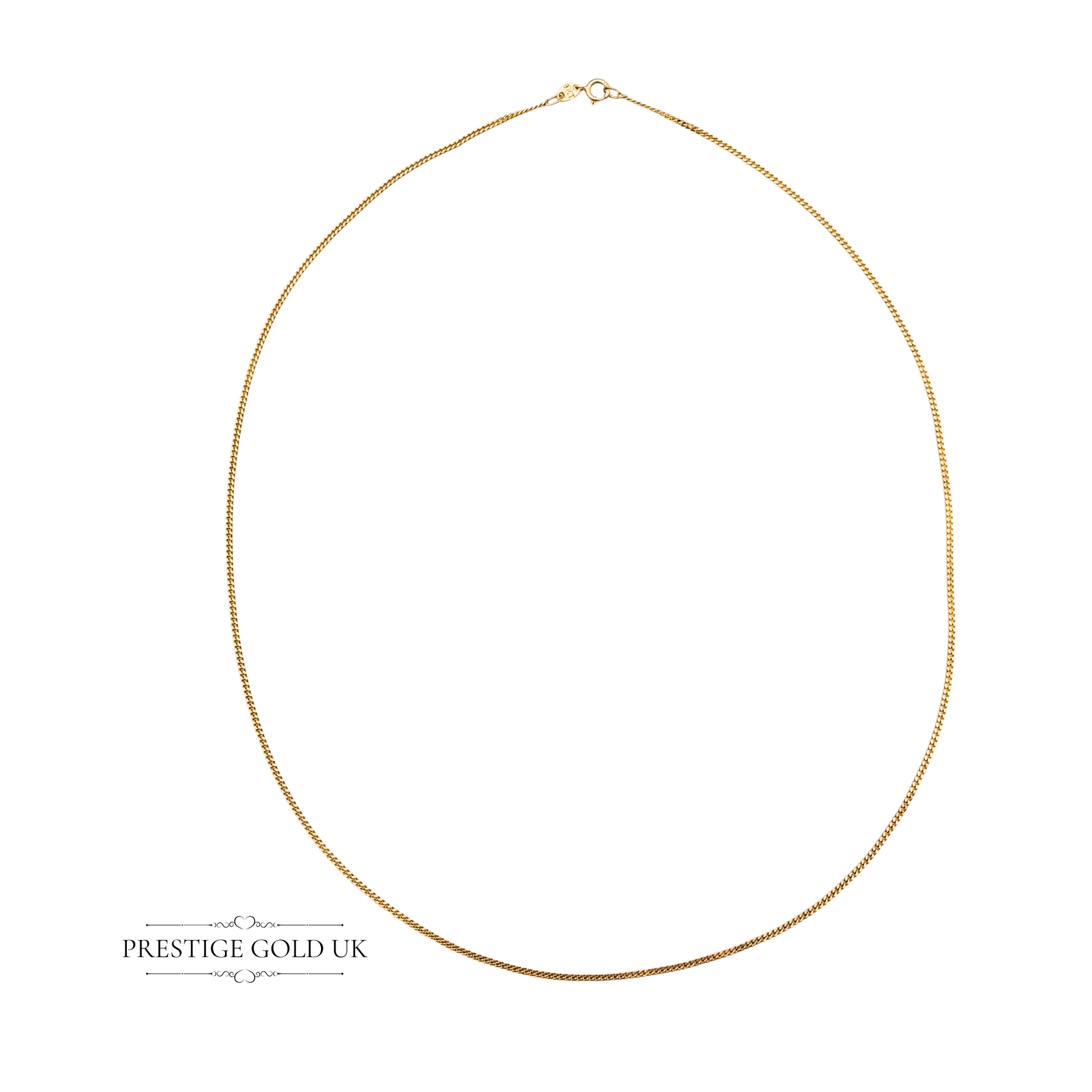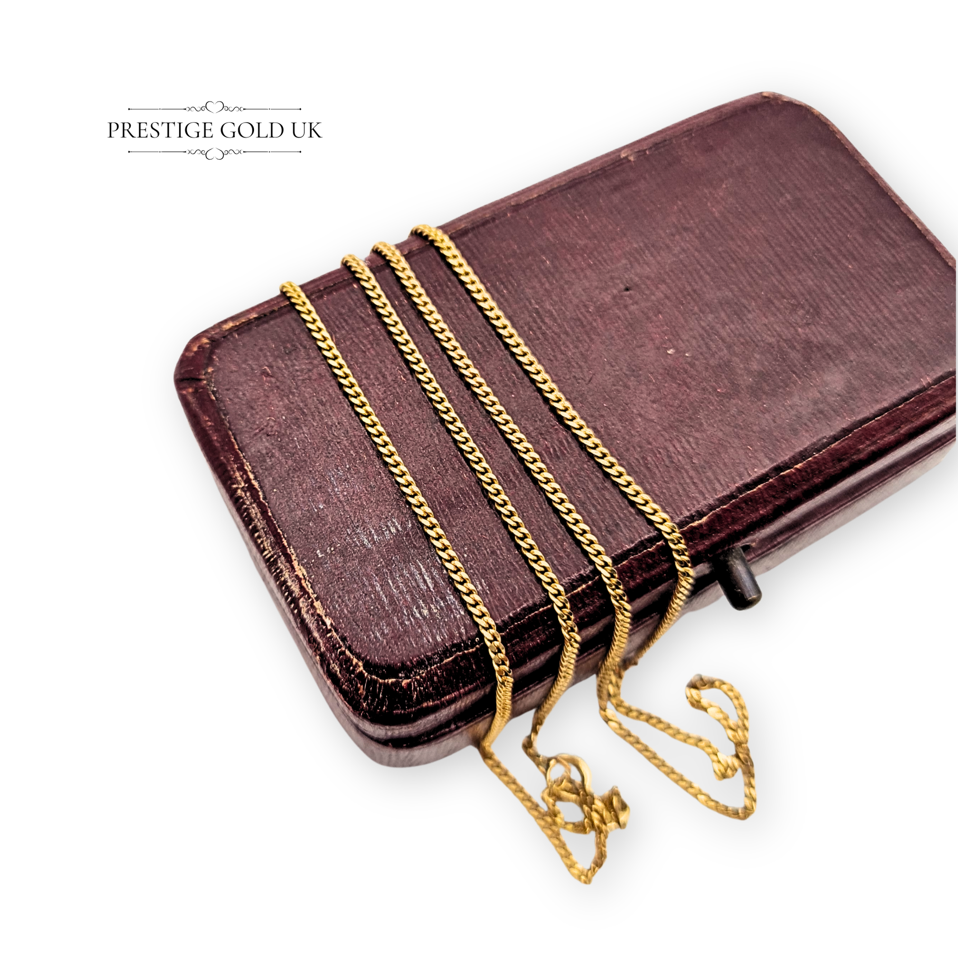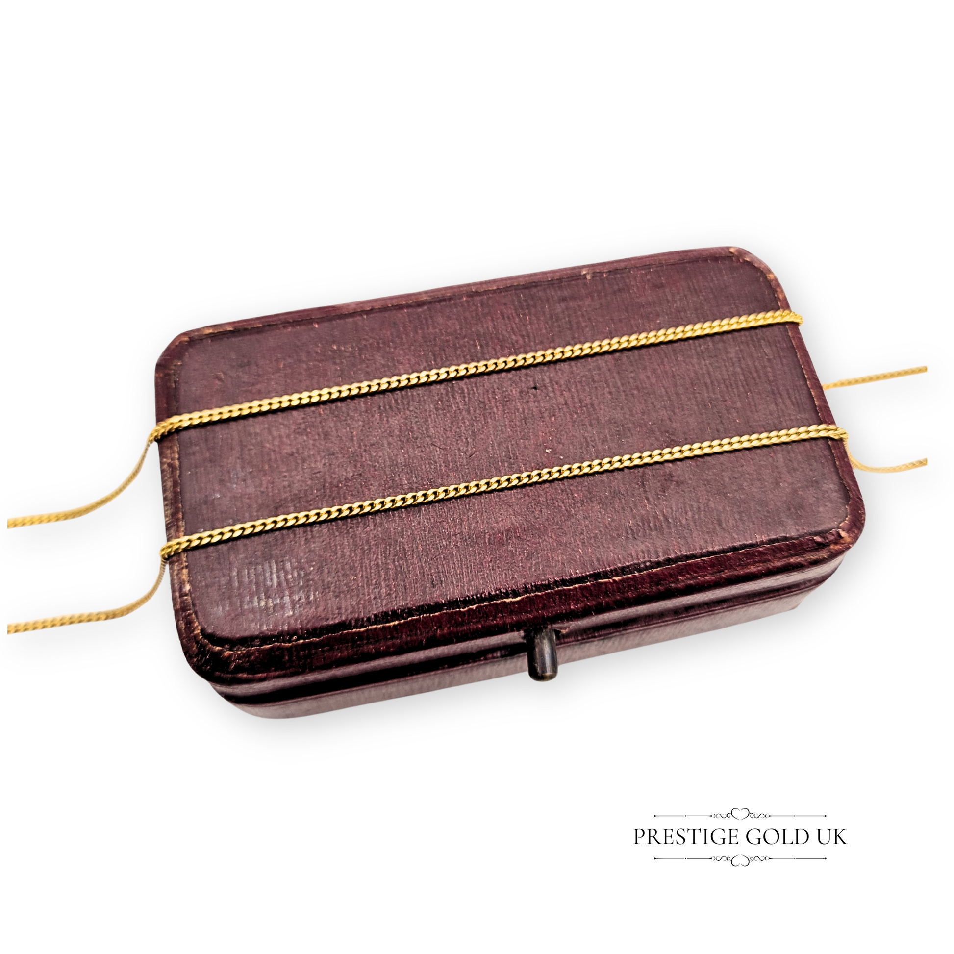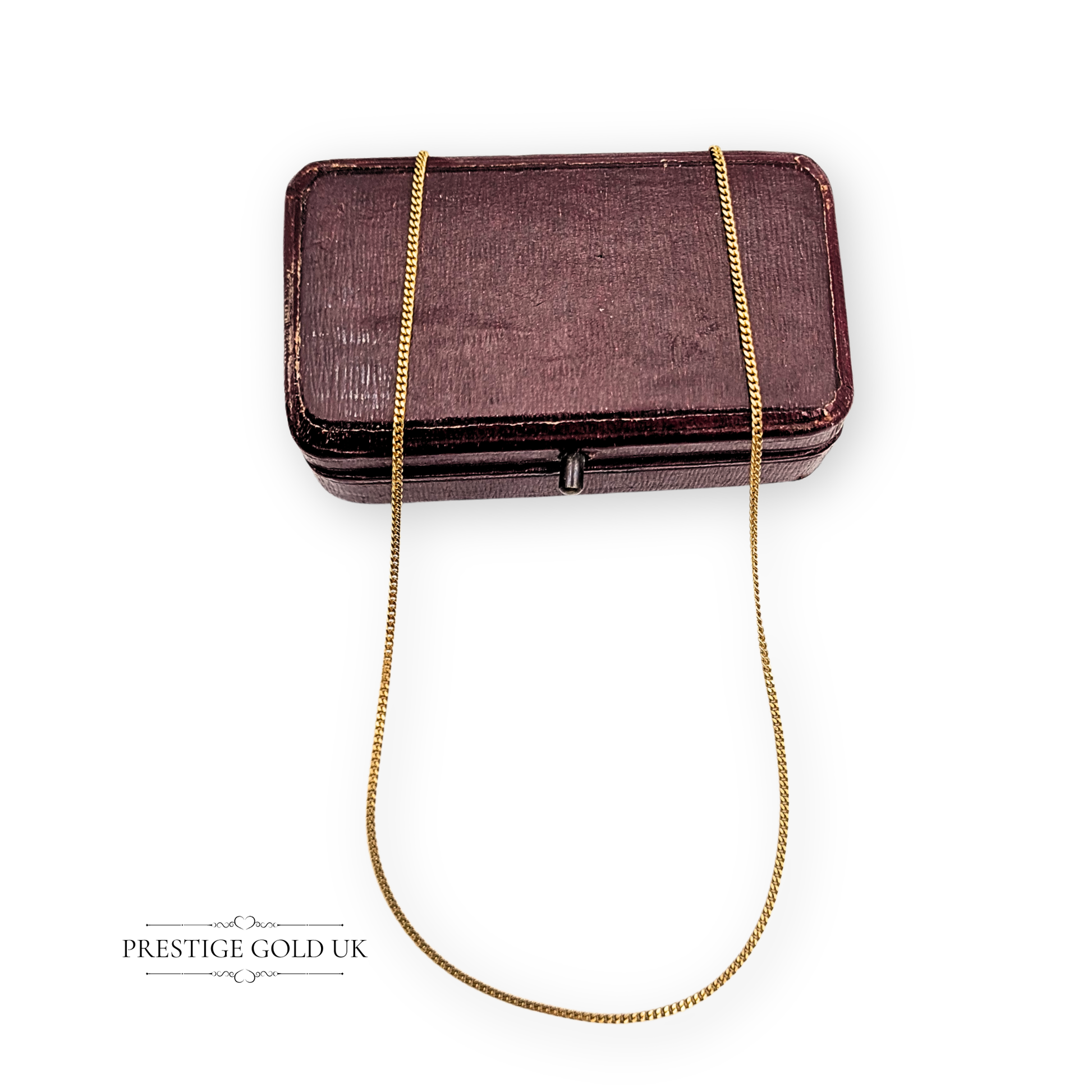 Fully hallmarked at Sheffield Import, this elegant 9ct gold curb chain brings refined simplicity to your collection. Measuring 18.5 inches (47cm) in length and 1.5mm in width, it features a narrow, lightweight design that sits beautifully against the neckline. Weighing 2.32 grams, the chain is finished with a secure spring ring clasp for easy wear and classic balance. Its smooth, polished links catch the light effortlessly — ideal for layering or for wearing alone as a subtle statement of vintage charm. Only one available.