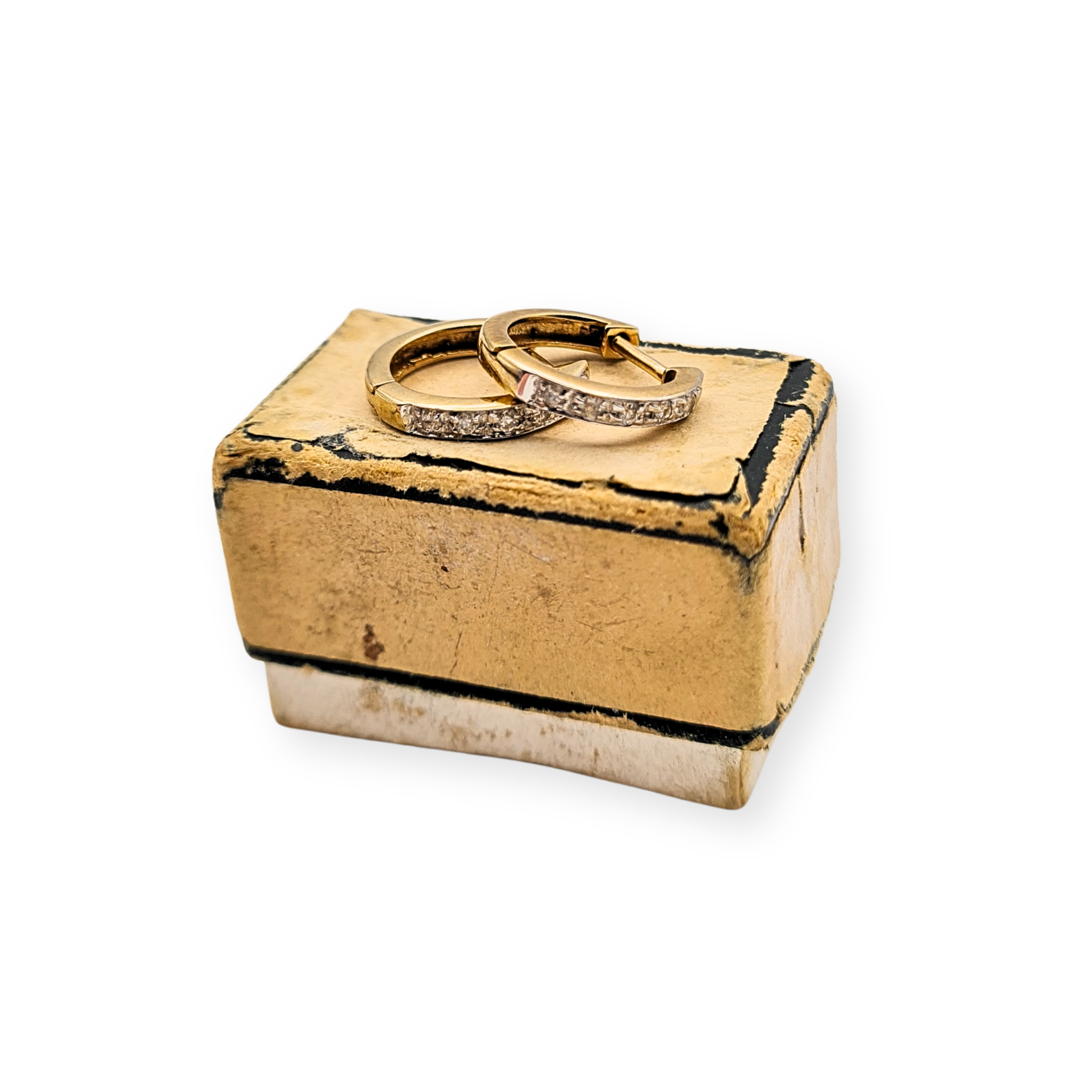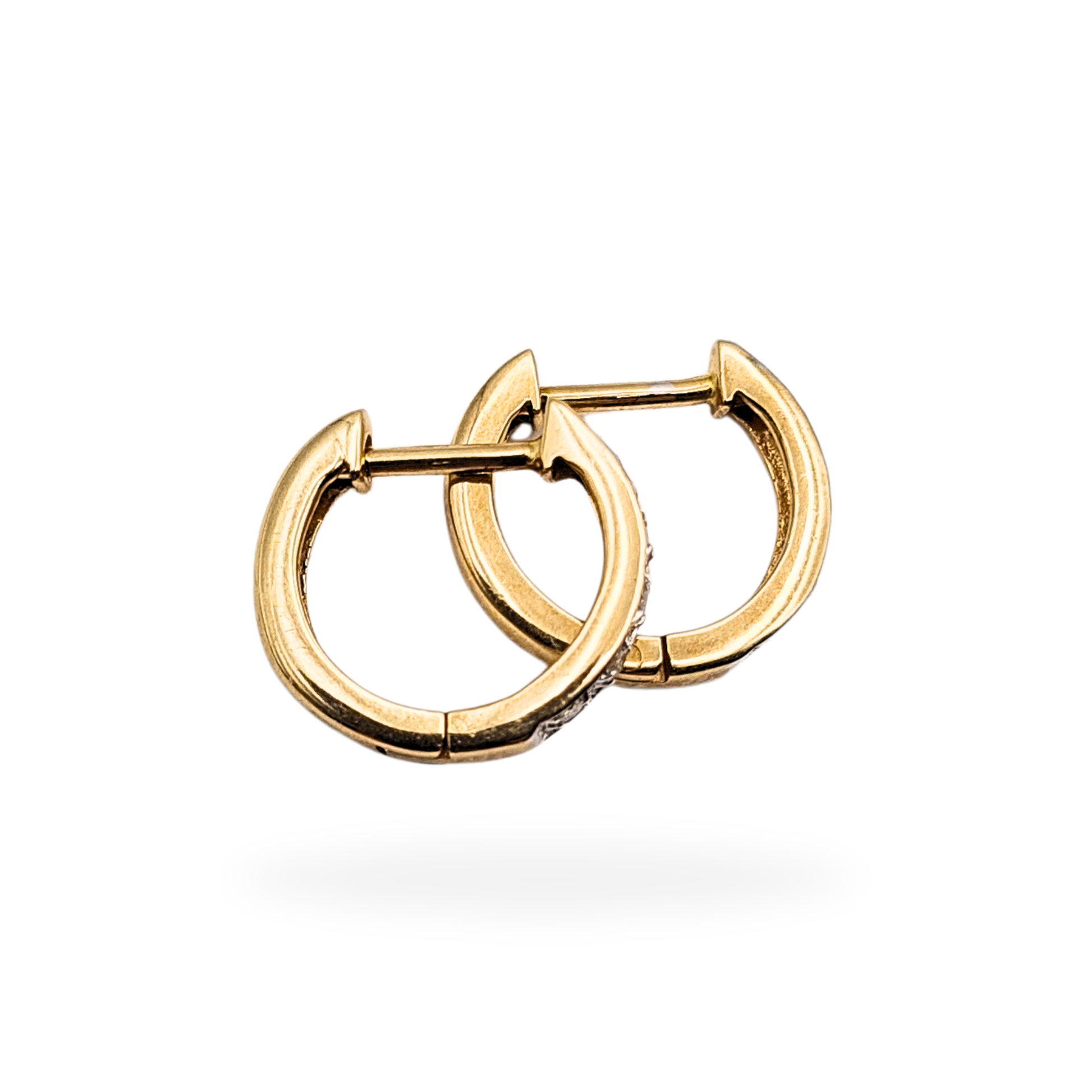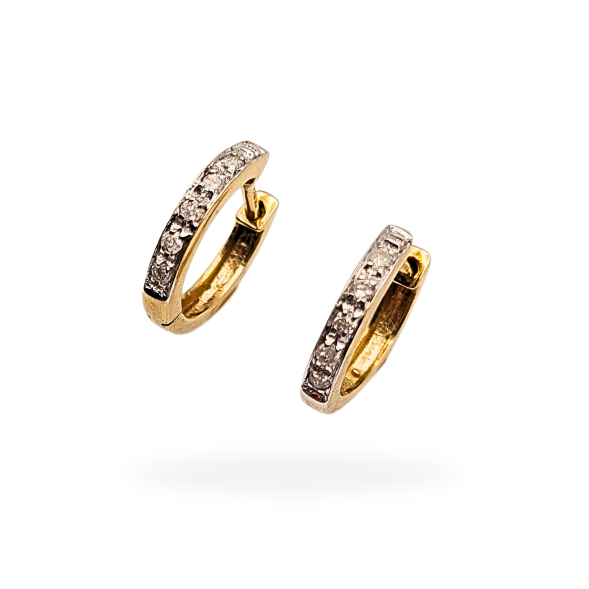 Fully hallmarked 9ct gold, these dainty diamond huggie hoop earrings feature a smooth hinged design for effortless wear and security. Each hoop measures approximately 12mm in diameter and 2mm wide, set with a fine line of bright-cut diamonds that add just the right amount of sparkle. Crafted in solid yellow gold with a polished finish, they offer everyday luxury in a petite, refined silhouette — ideal for stacking or wearing solo. Light at just 1.22g, yet beautifully substantial and well-balanced. Only one pair available.