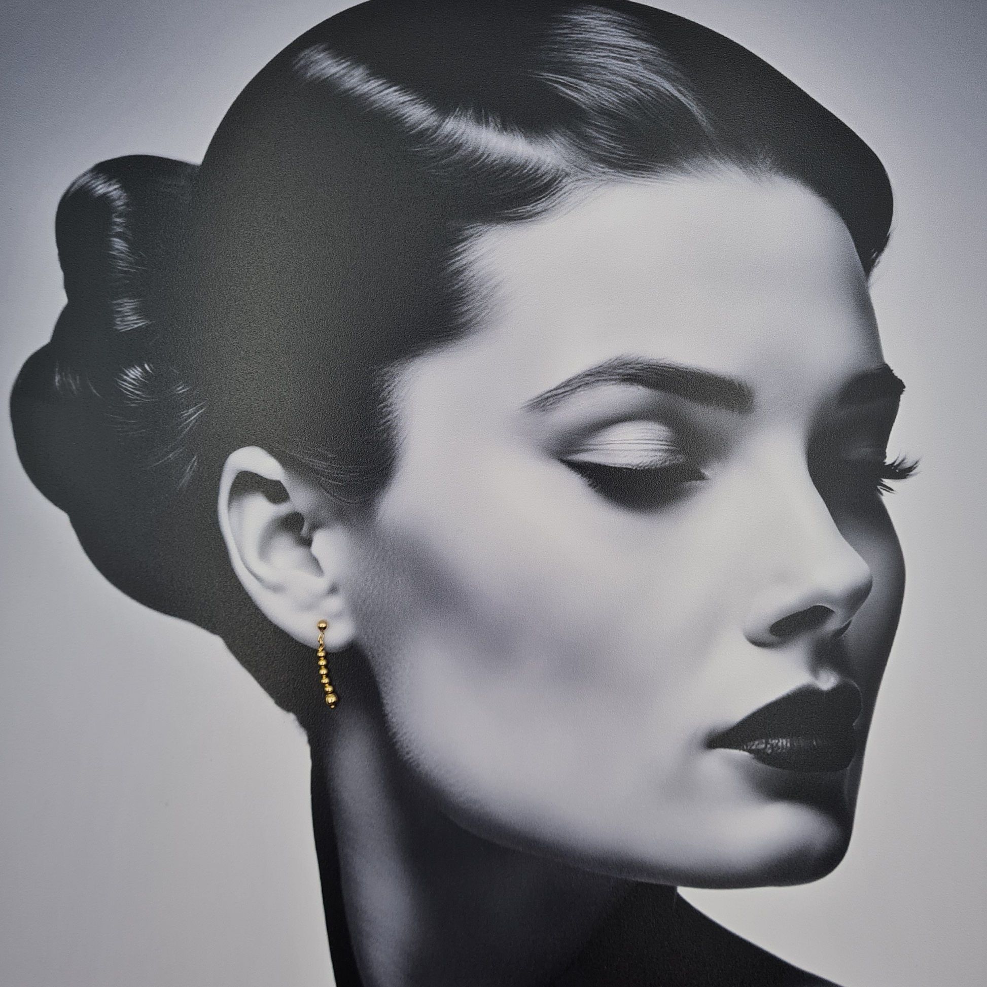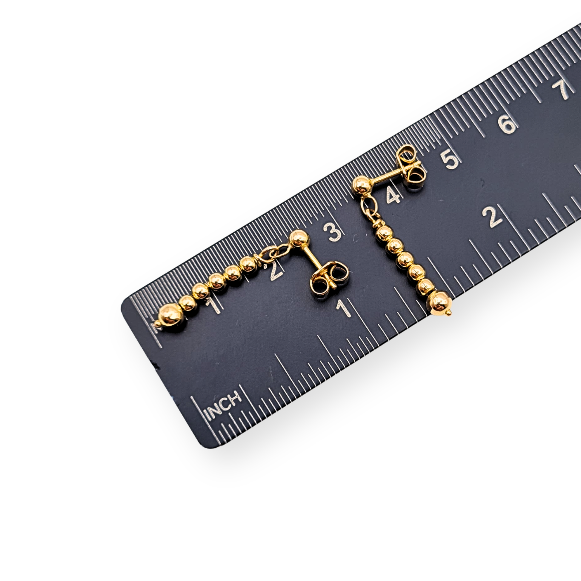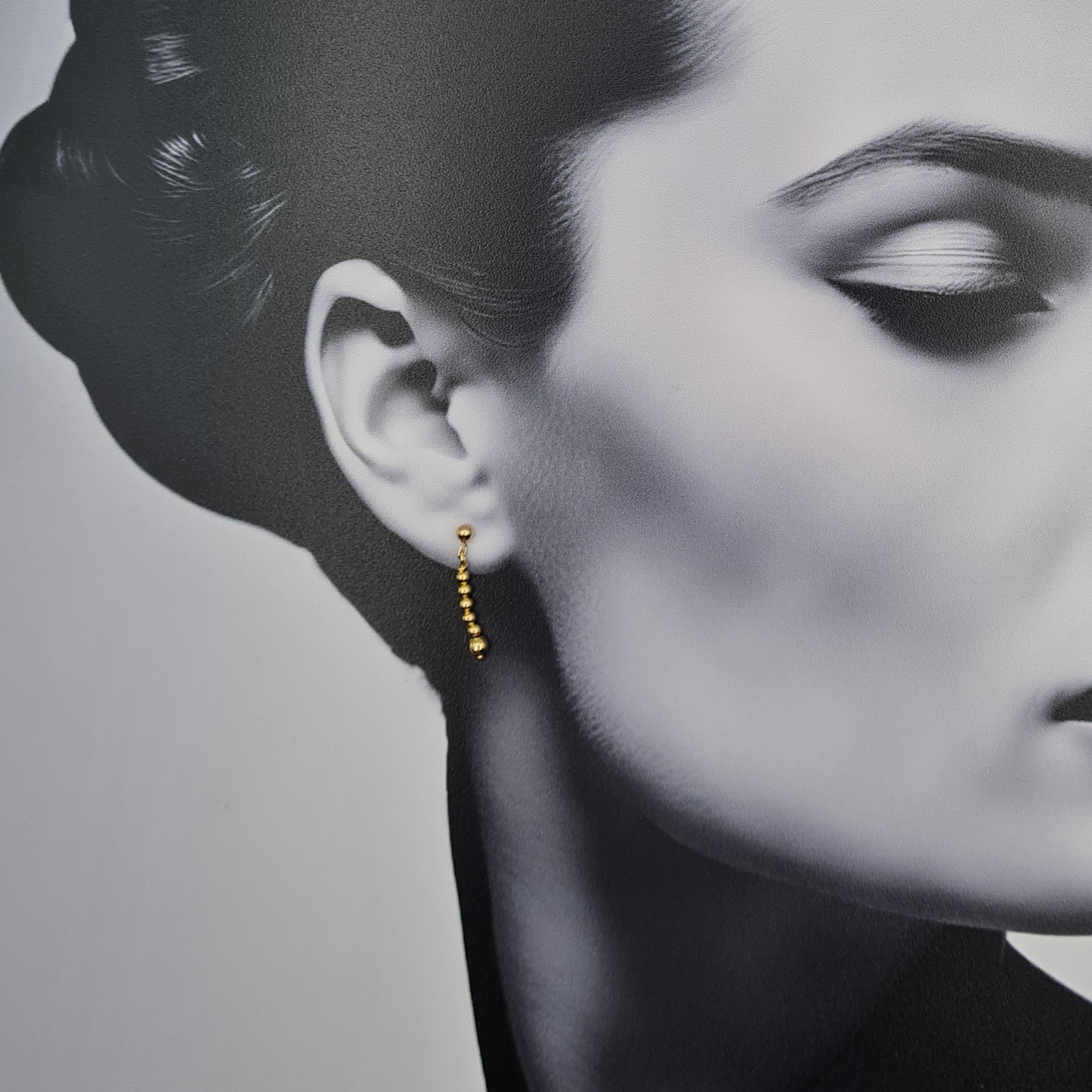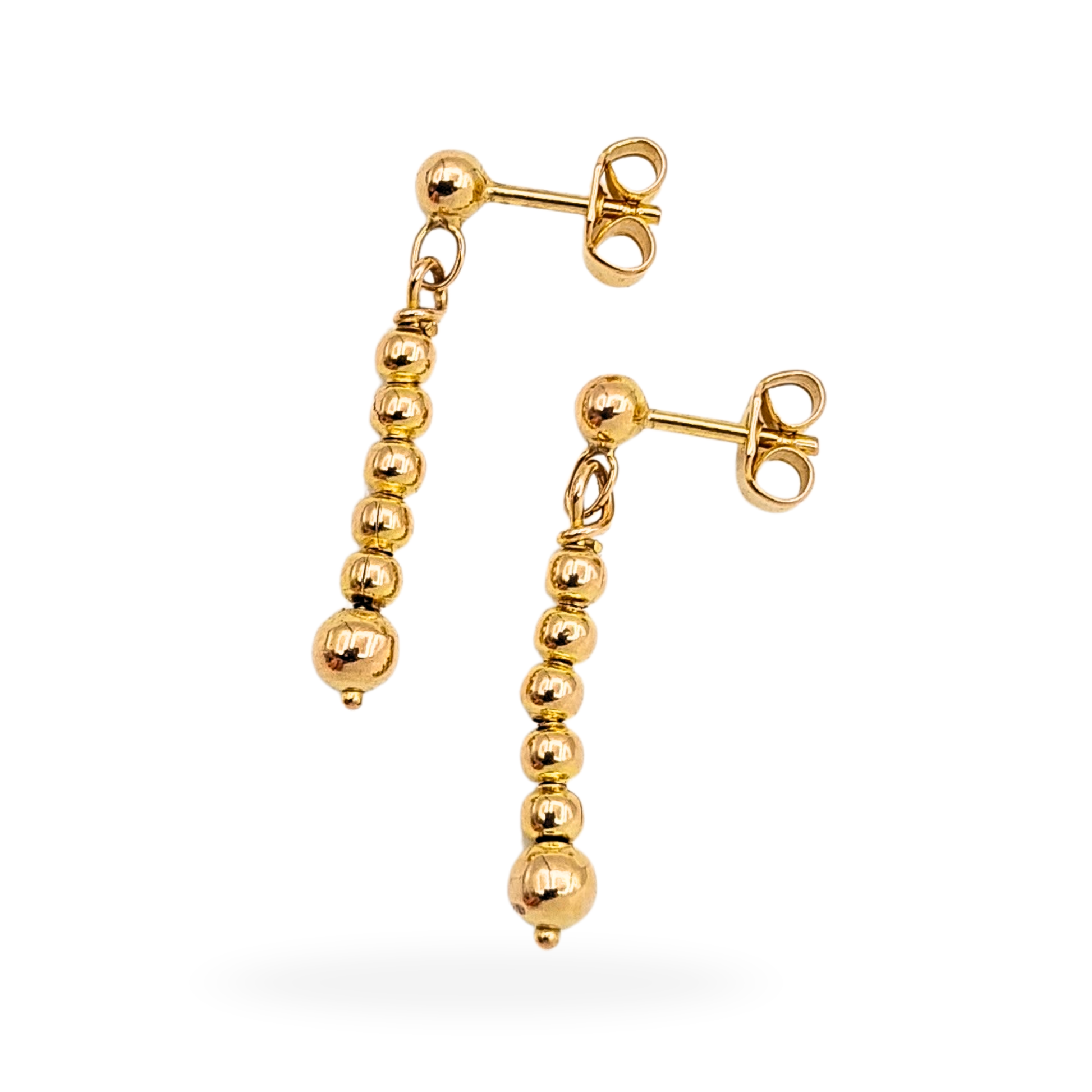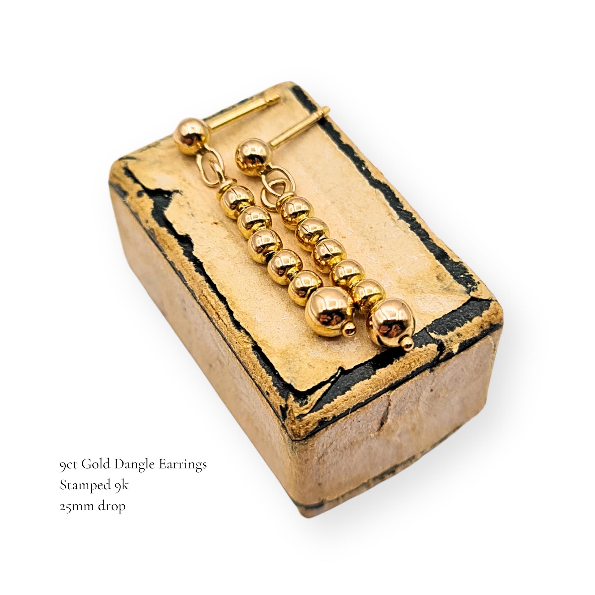 Stamped 9k and weighing just 1.47g, these 9ct gold dangle earrings feature a graceful drop of 25mm formed from a line of polished gold beads that catch the light beautifully with every turn. The simple yet refined design offers an understated touch of movement — ideal for everyday wear or layering with other gold pieces. Fitted with secure butterfly backs and finished to a soft golden sheen, they make a lovely, wearable pair that transitions seamlessly from day to evening. Only one available.