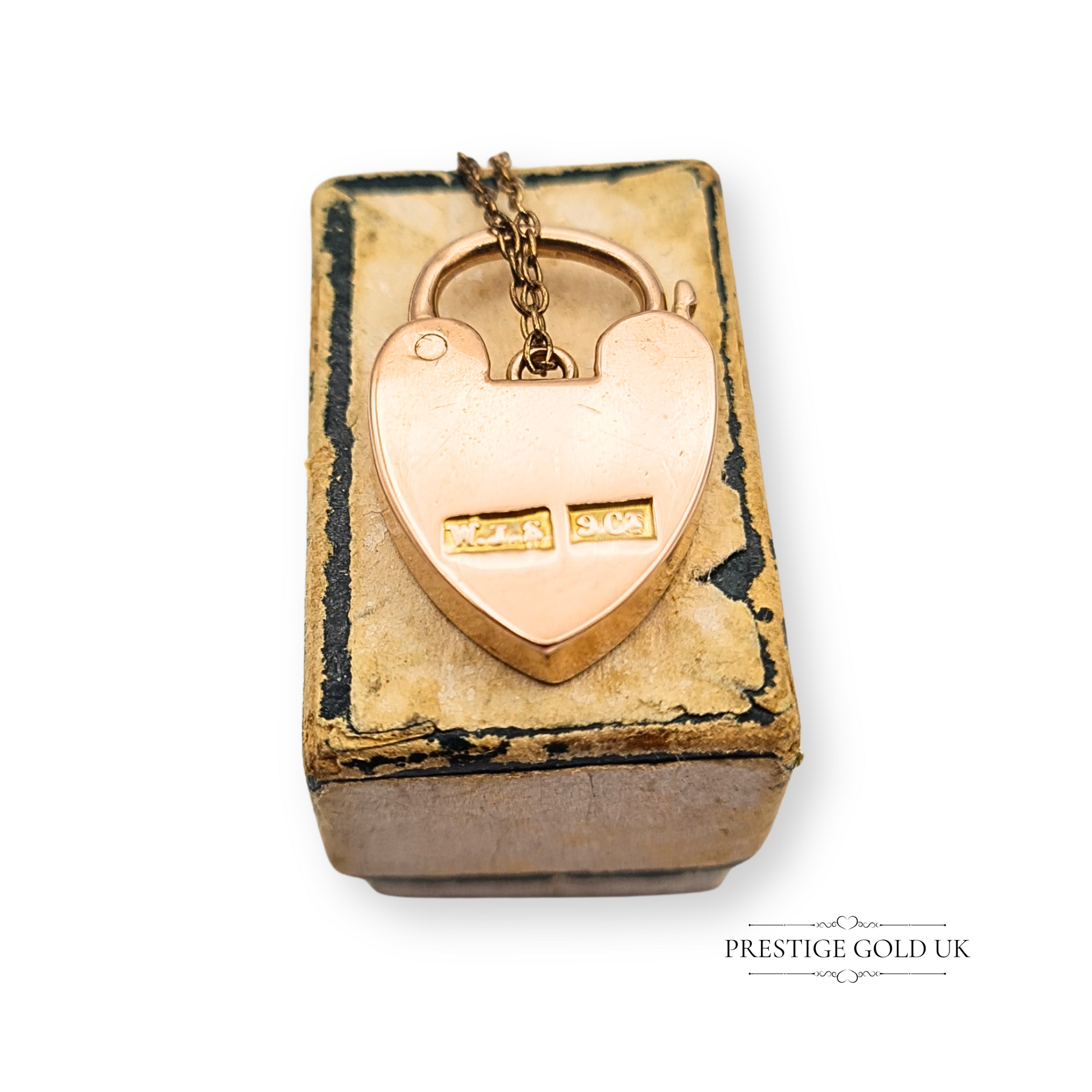 Stamped 9ct and weighing 2.9g, this antique rose gold padlock pendant is a beautifully engraved heart design complete with its original safety chain. The secure working clasp and classic engraving make it ideal to wear as a pendant, bracelet clasp, or as a collector’s charm. A one-off antique treasure, combining warmth of rose gold with elegant Victorian-inspired style. Only one available.