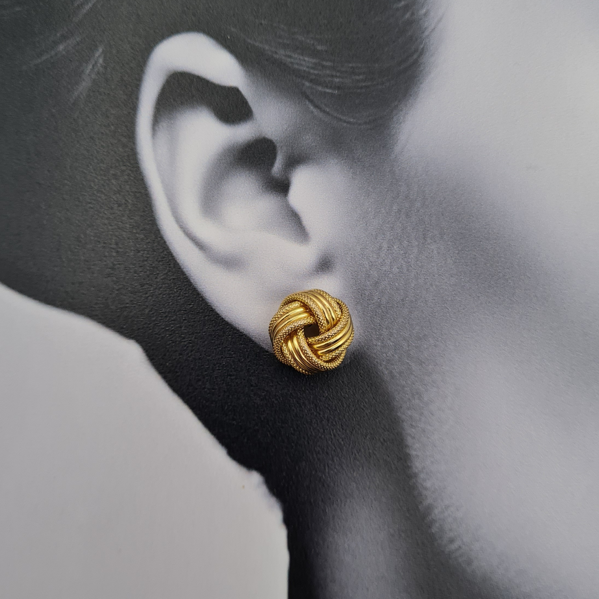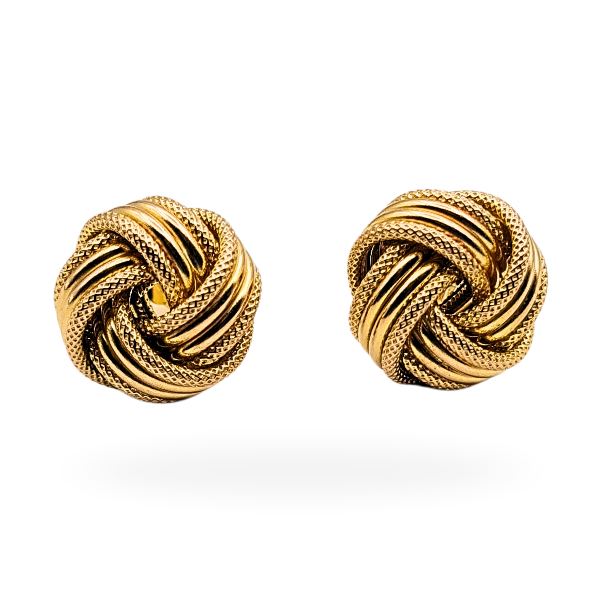 A classic and elegant pair of 9ct gold twist knot stud earrings, featuring a beautifully crafted textured and polished rope design. These earrings weigh 3.24g in total and measure 12mm across the face, offering a substantial and refined look suitable for both daily wear and special occasions. Fully hallmarked and stamped 375 for 9ct gold, they combine intricate craftsmanship with timeless appeal.