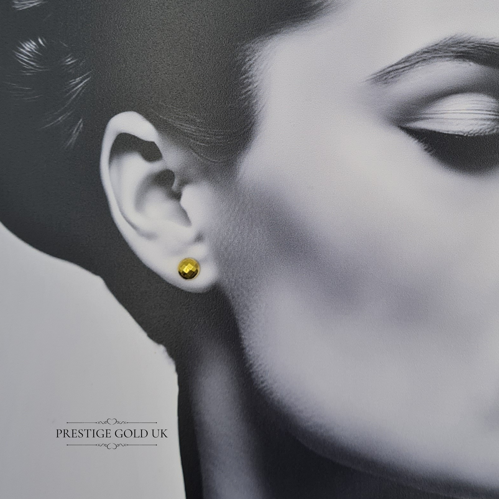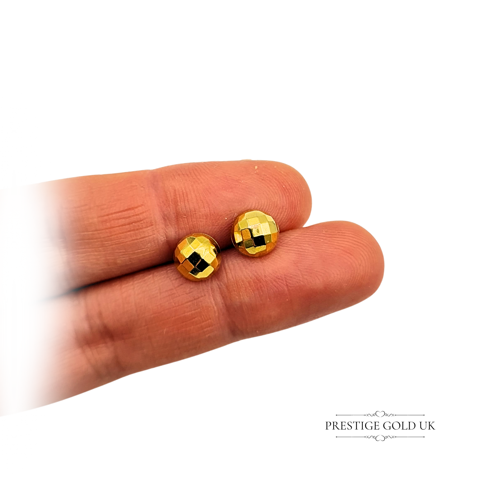 Hallmarked in London in 1979 and weighing 0.63g, these 9ct gold geometric stud earrings showcase a refined faceted dome design that beautifully reflects the light with every movement. Finished with secure butterfly backs for comfortable wear, these authentic 375-stamped earrings are a charming example of late 1970s British gold craftsmanship.