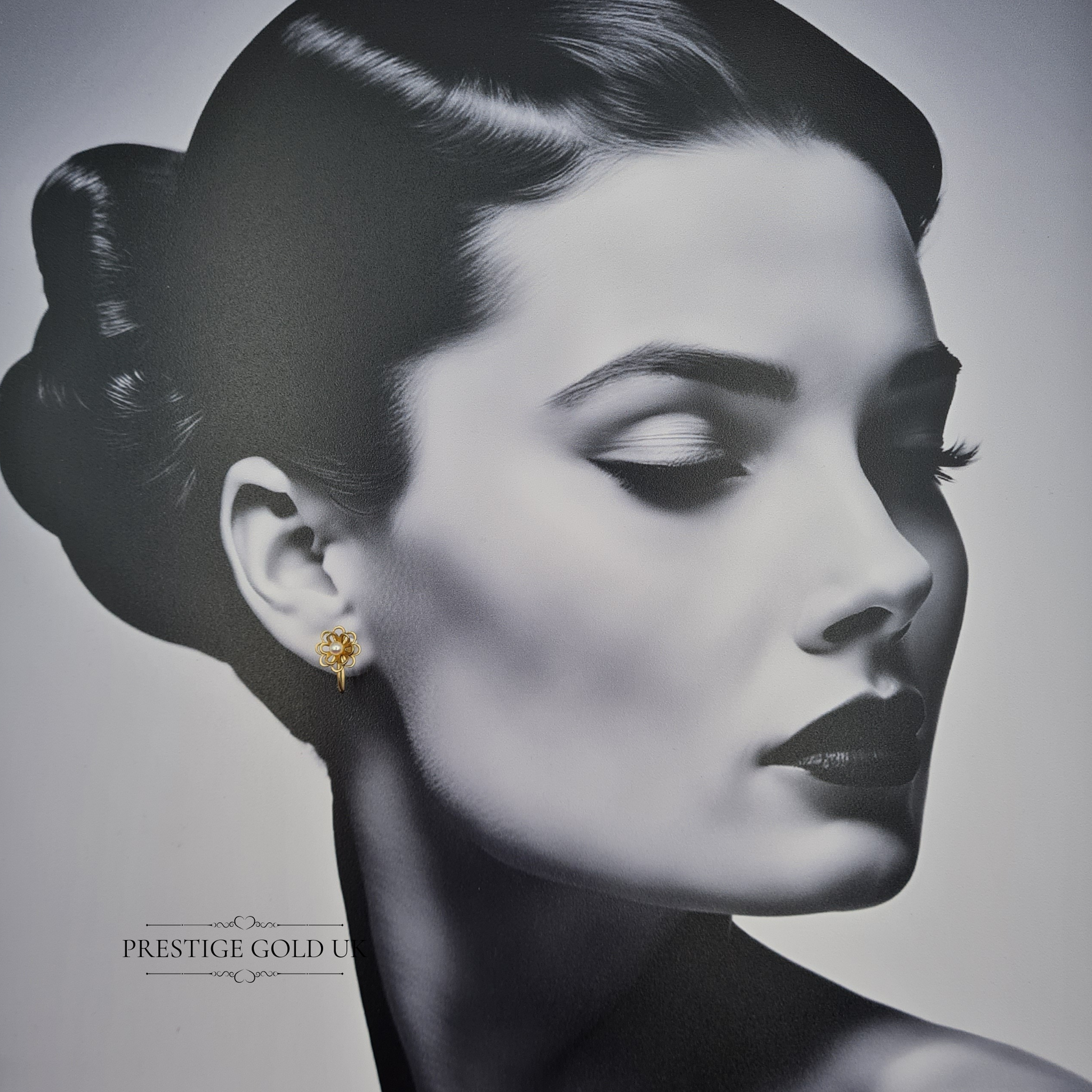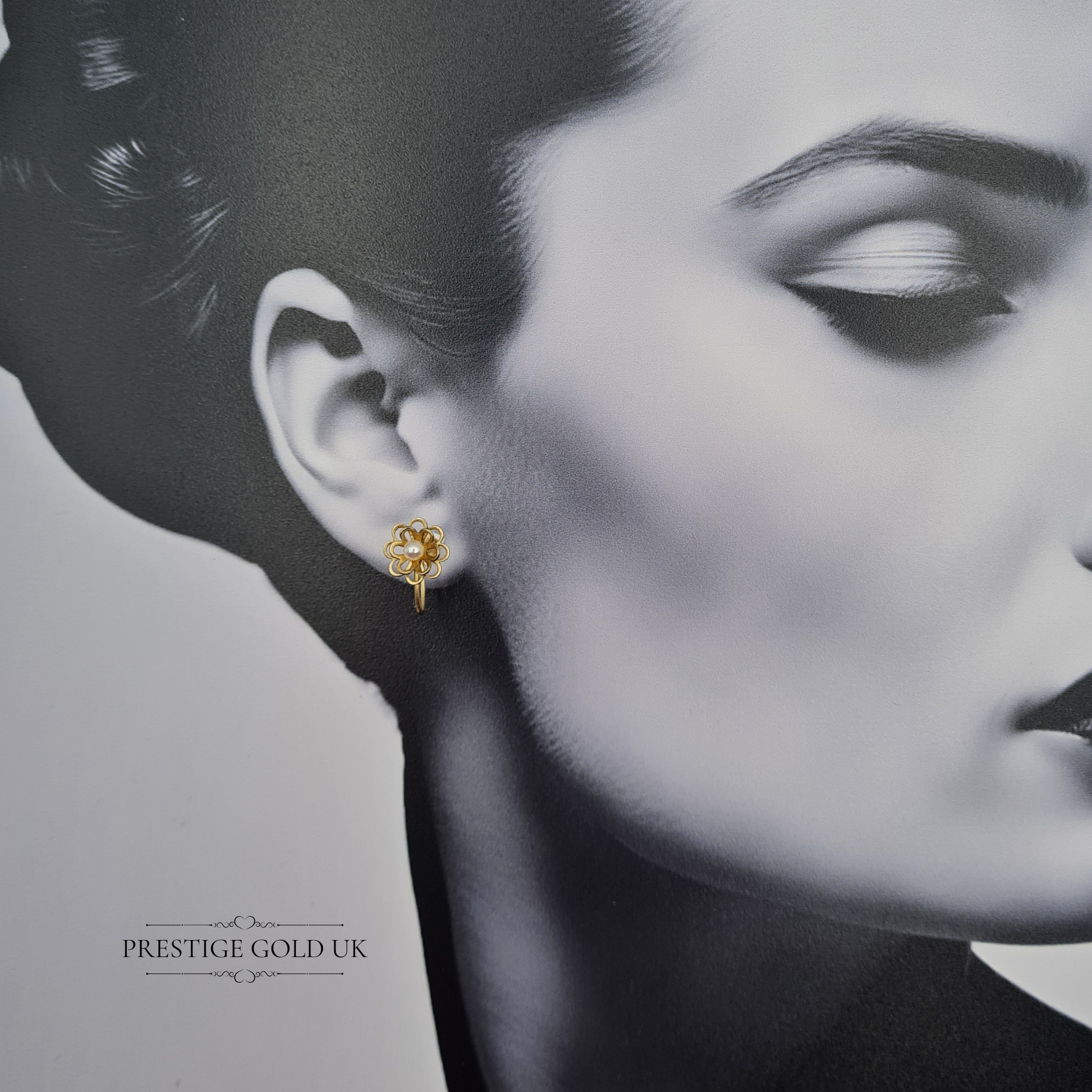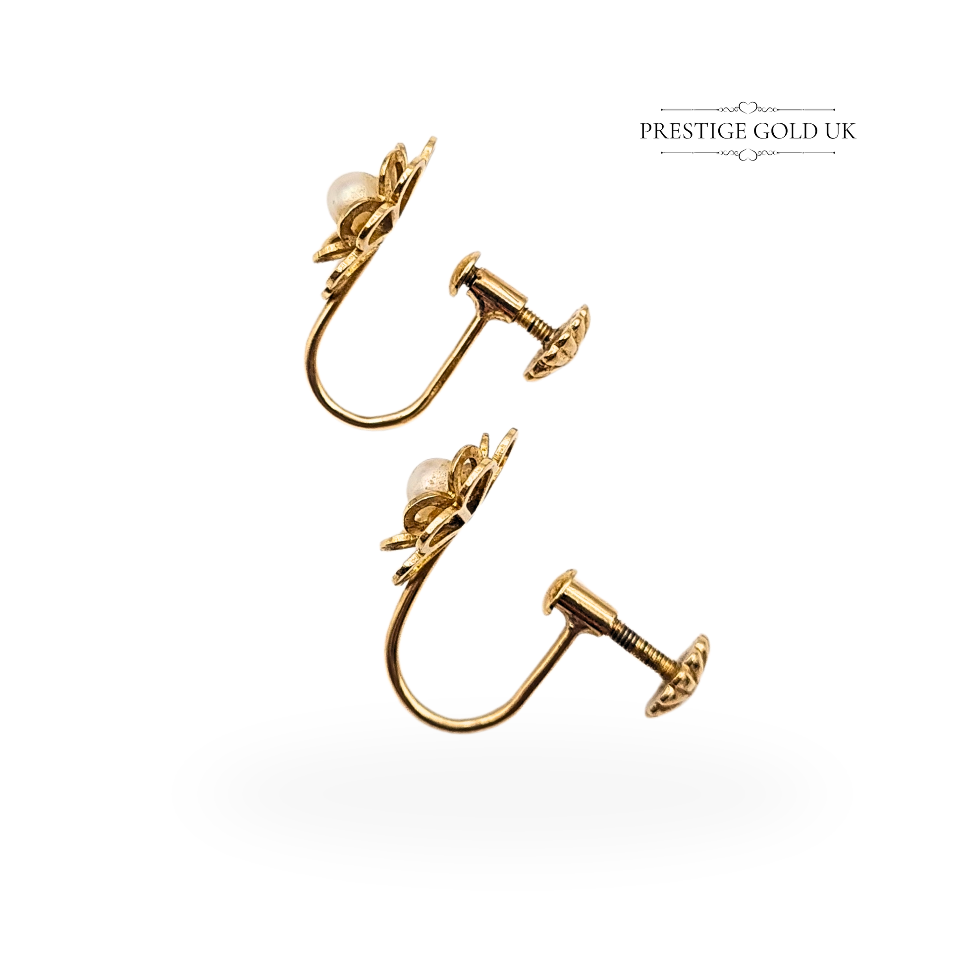 Hallmarked in Birmingham and weighing 2.12g, these elegant 9ct gold screw-back earrings feature a finely detailed open-petal floral design centred with luminous 3.5mm pearls. Measuring 11mm across, they capture the delicate charm of mid-century craftsmanship, freshly polished to a soft golden sheen while preserving their vintage integrity. Comfortable and secure with classic screw-back fittings, they add a refined, feminine touch to any look — graceful for both day wear and evening elegance. Only one available.