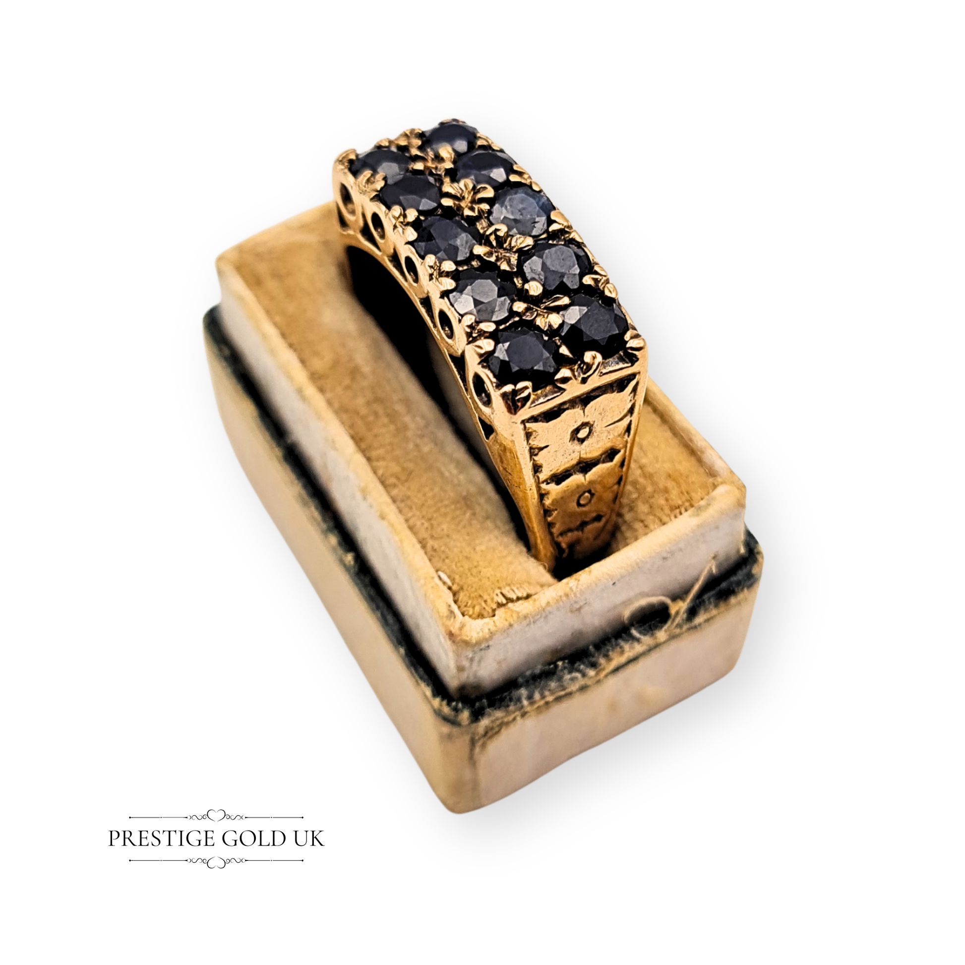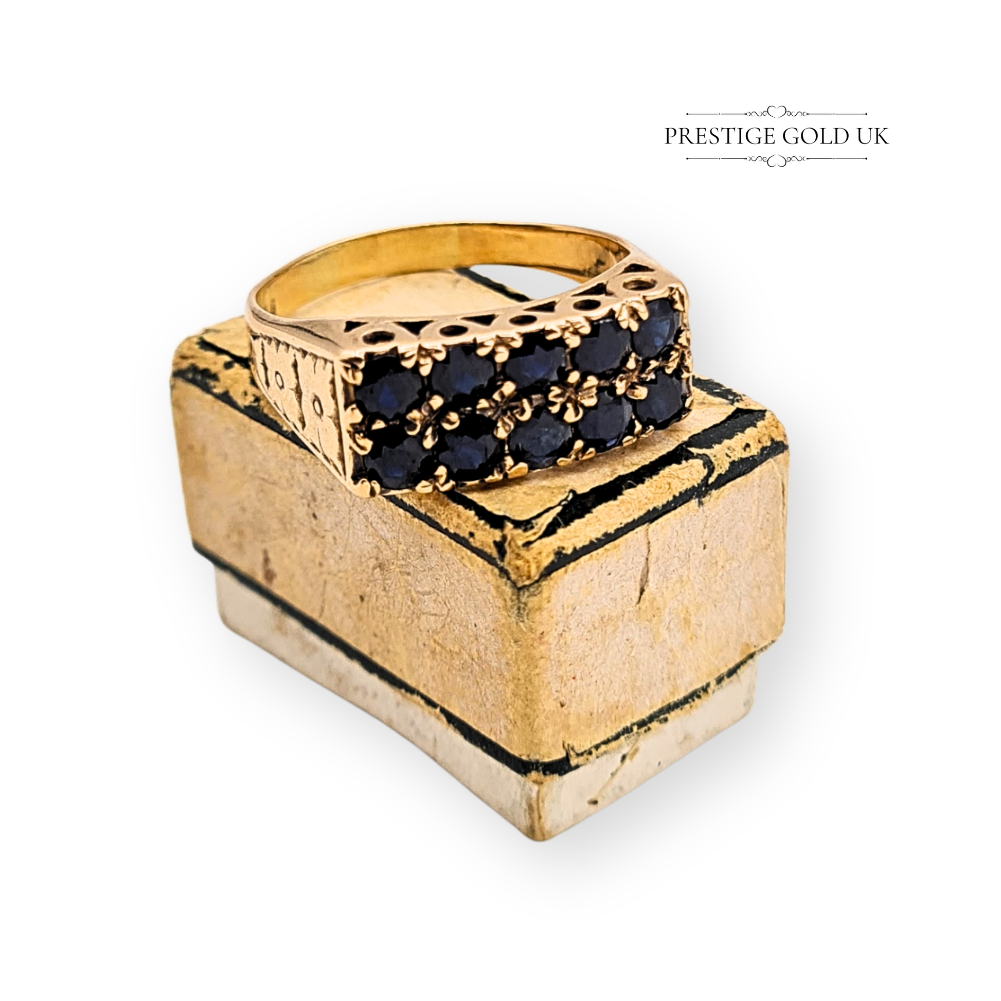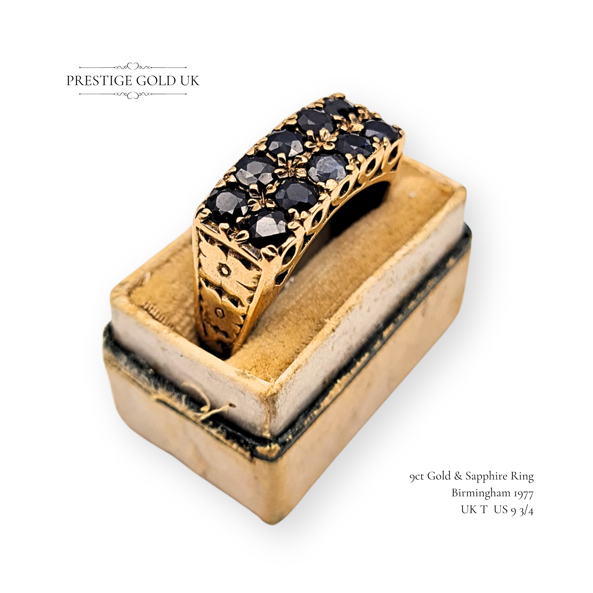 Fully hallmarked in Birmingham in 1977, this substantial 9ct yellow gold ring showcases a striking twin row of deep blue sapphires in a bold, floral-claw setting. Weighing 5.04g, the wide 18 x 7mm face captures the confident character of 1970s design — richly detailed with hand-engraved shoulders and openwork sides that highlight each gem’s depth of colour. Size UK T (US 9 3/4), this large statement piece offers both presence and craftsmanship, freshly polished to restore its original golden lustre. Only one available.