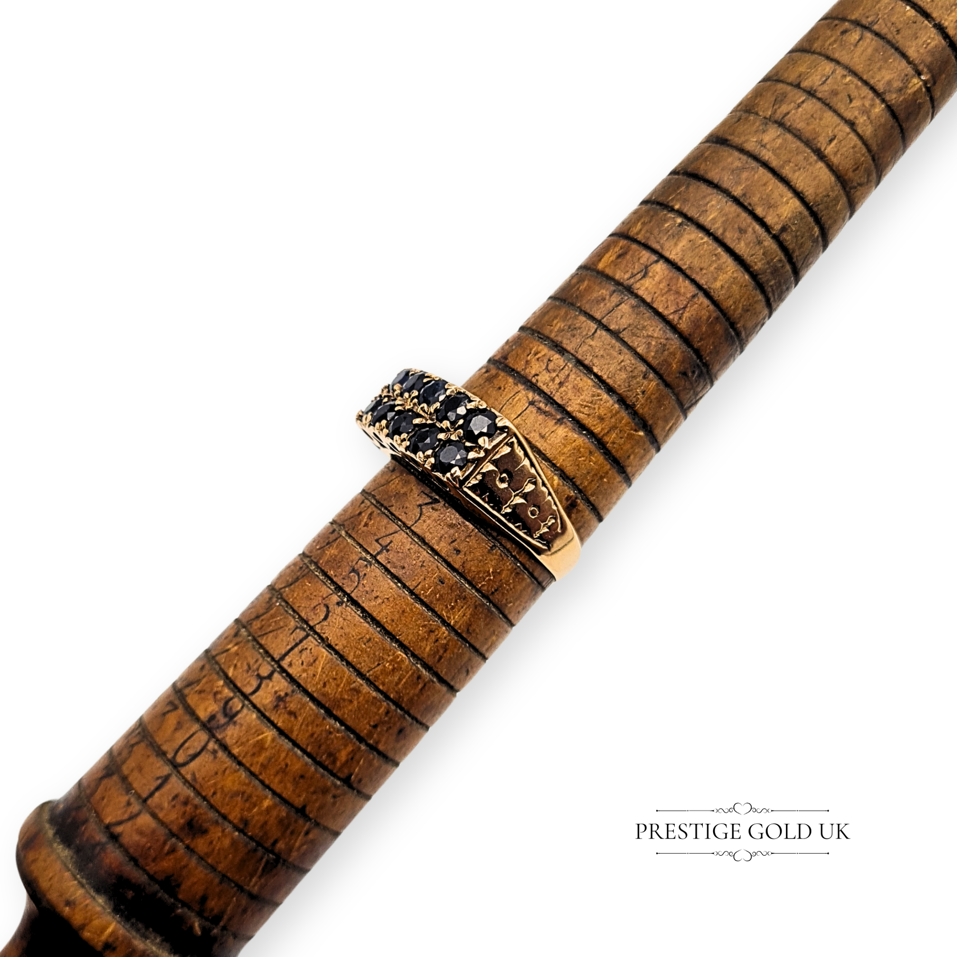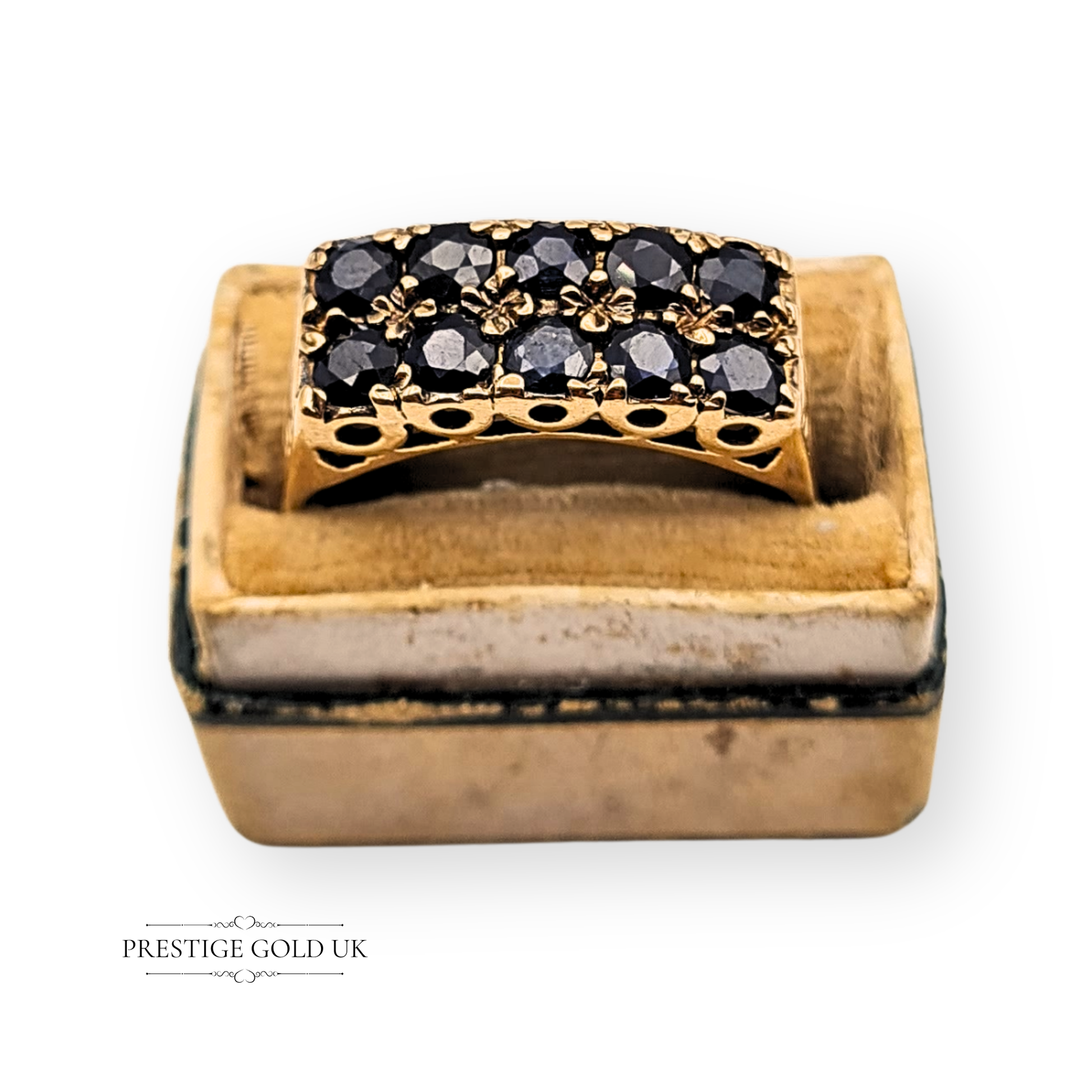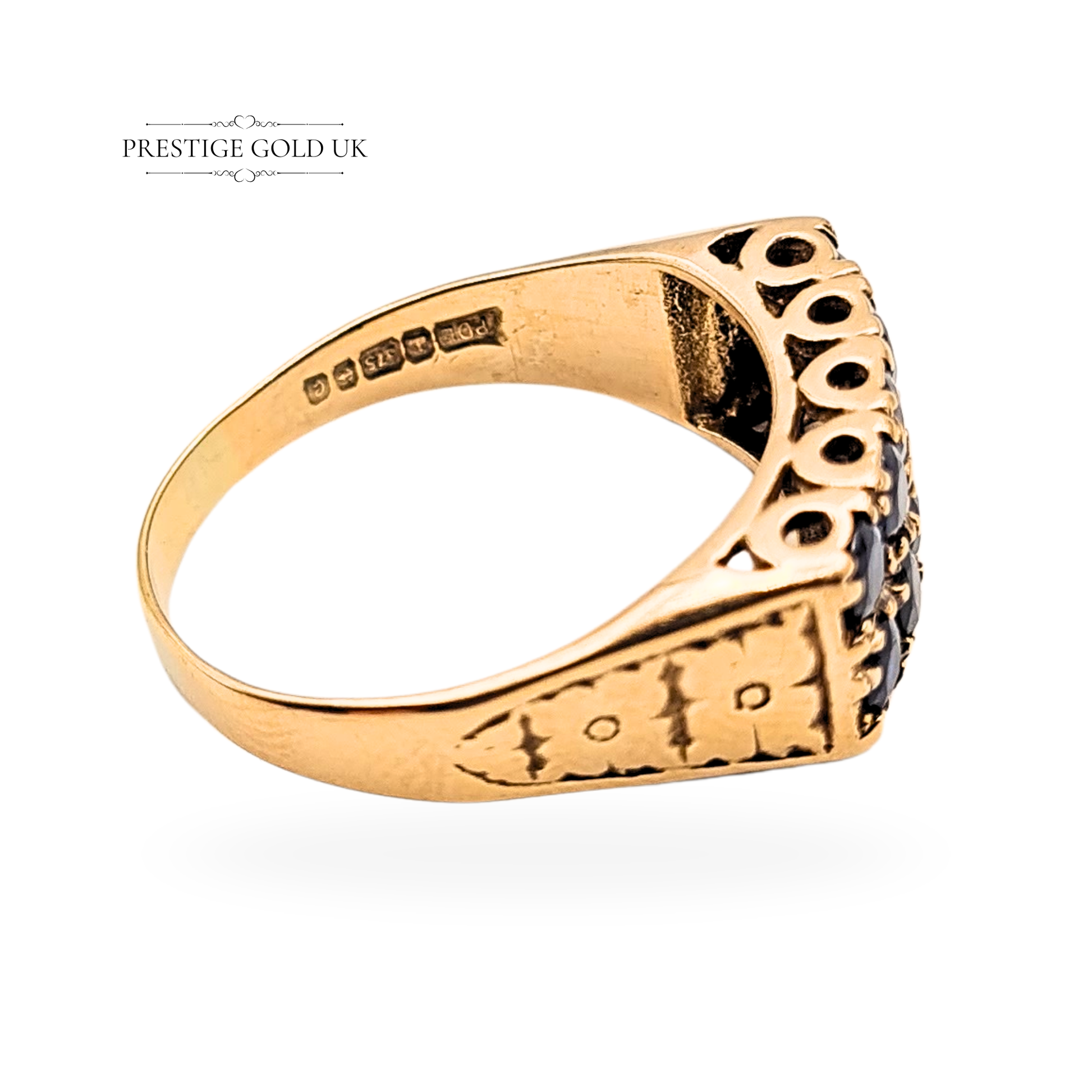 Fully hallmarked in Birmingham in 1977, this substantial 9ct yellow gold ring showcases a striking twin row of deep blue sapphires in a bold, floral-claw setting. Weighing 5.04g, the wide 18 x 7mm face captures the confident character of 1970s design — richly detailed with hand-engraved shoulders and openwork sides that highlight each gem’s depth of colour. Size UK T (US 9 3/4), this large statement piece offers both presence and craftsmanship, freshly polished to restore its original golden lustre. Only one available.