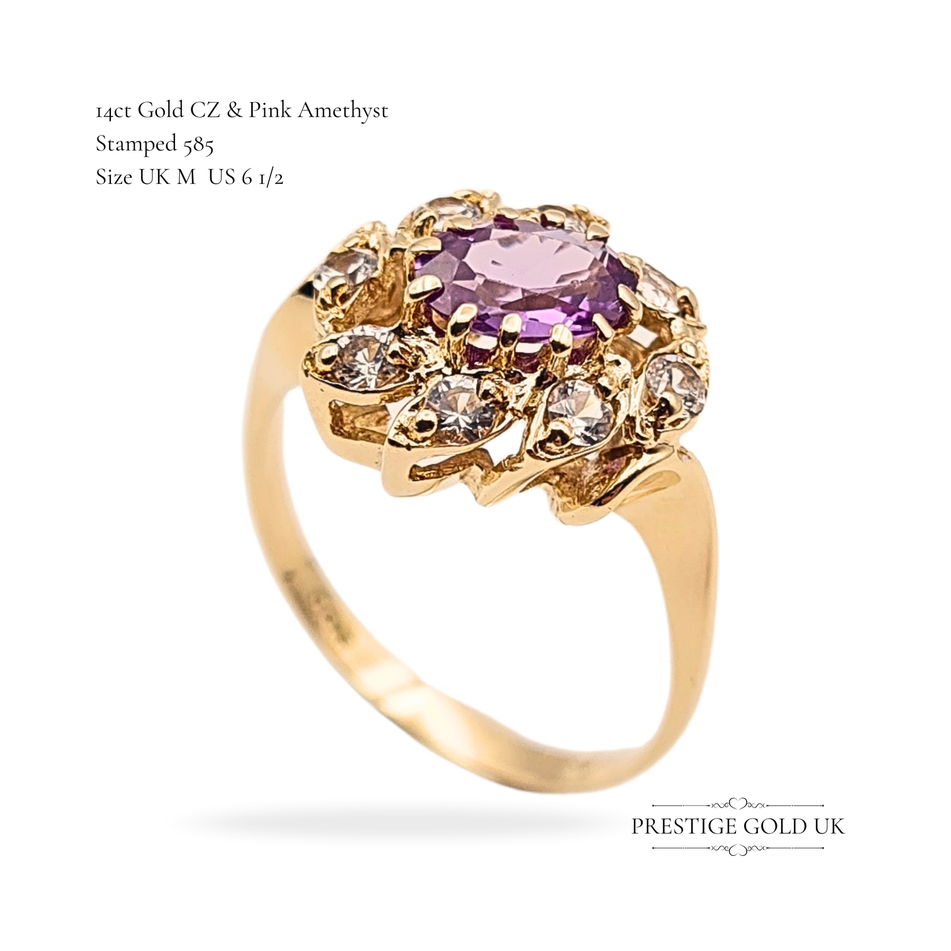 Weighing 3.1g and stamped 585, this 14ct gold ring presents a striking oval pink amethyst at its centre, encircled by sparkling CZ accents in an elegant cluster design. Sized UK M (US 6 1/2), it is a refined piece that balances bold colour with intricate detail, perfect for special occasions or everyday elegance. Only one available.