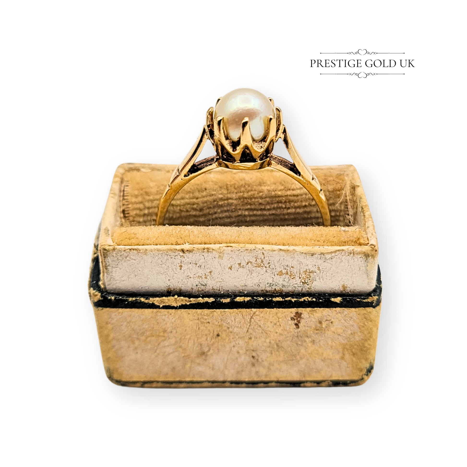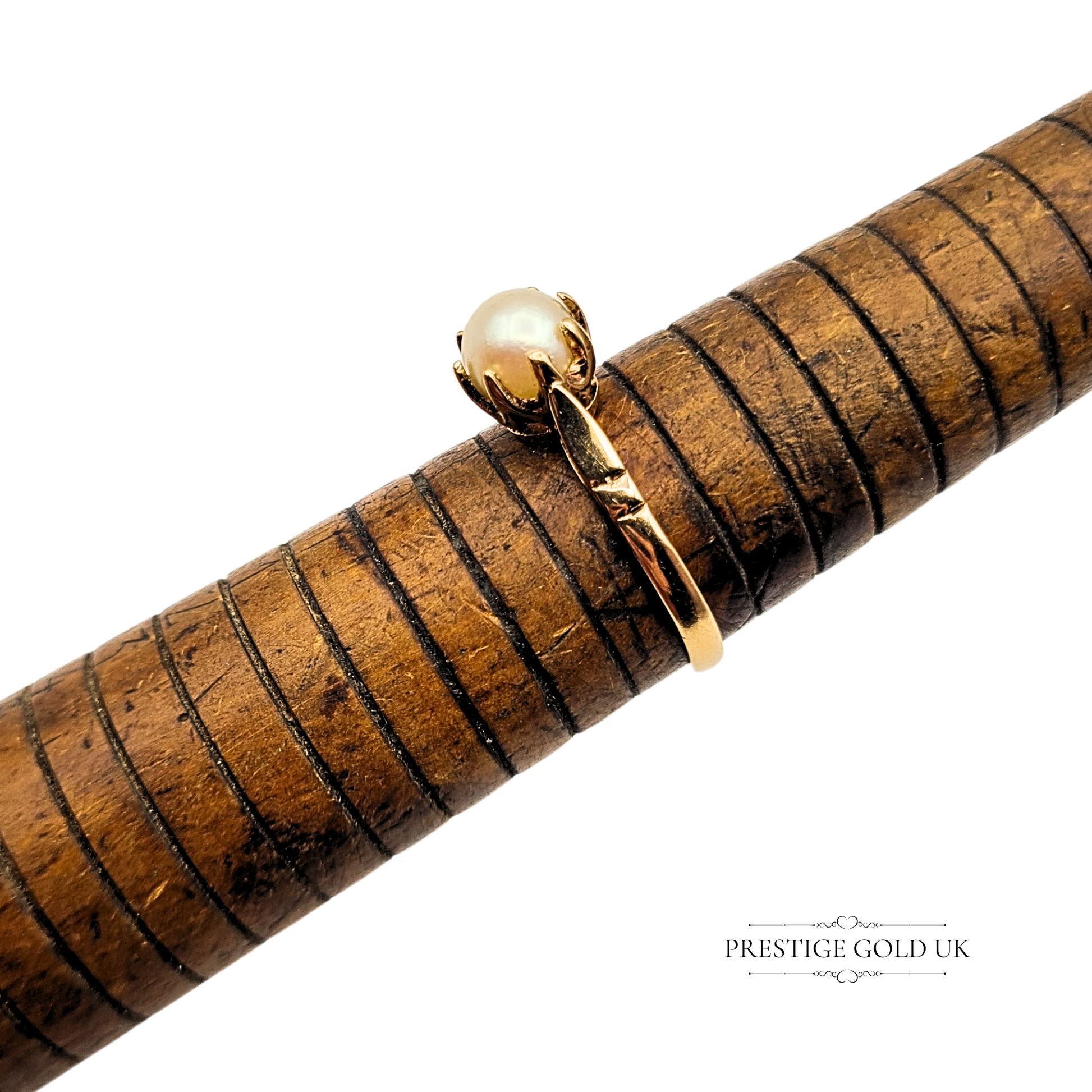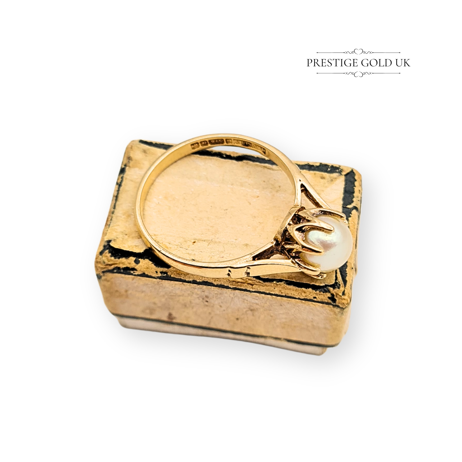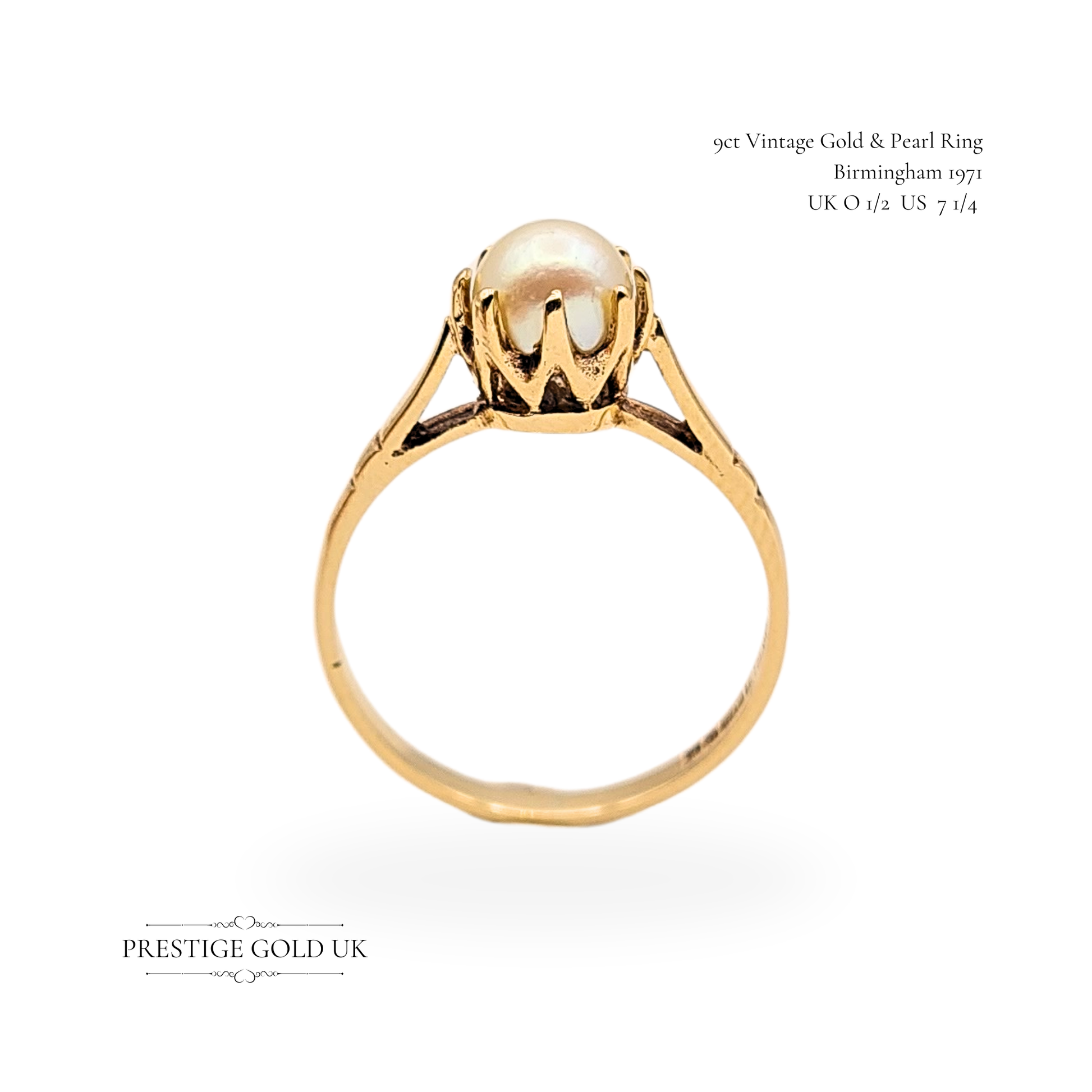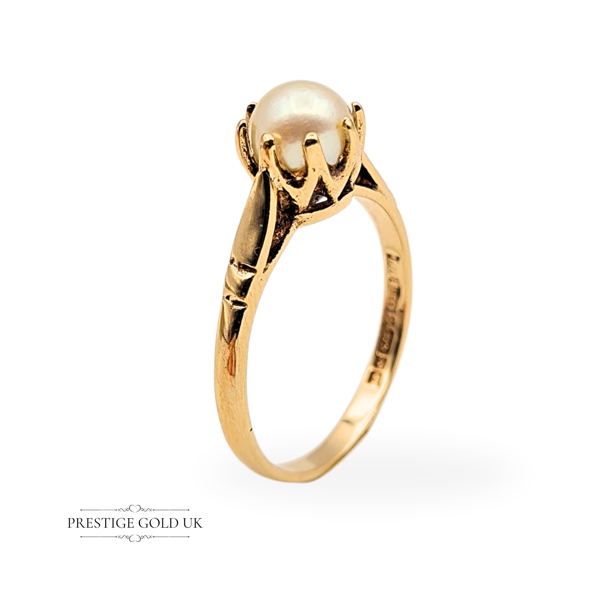 Hallmarked in Birmingham in 1971, this 9ct gold pearl solitaire ring is a graceful vintage piece that carries both warmth and character. The ring features a luminous 5mm cultured pearl, held securely in an intricate claw setting with elegant engraved shoulders that taper gently towards the band. Weighing 2.26g and sized UK O 1/2 (US 7 1/4), it wears beautifully as a statement solitaire or as a refined engagement alternative. A timeless treasure that reflects classic 1970s British craftsmanship. Only one available.